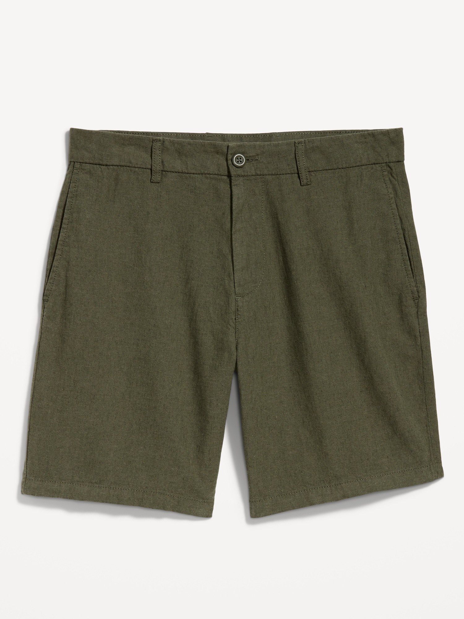 Slim Rotation Linen-Blend Chino Shorts — 8-inch inseam: button front, belt loops, zip fly, on-seam pockets, back welt pockets with button closure at left, #845880