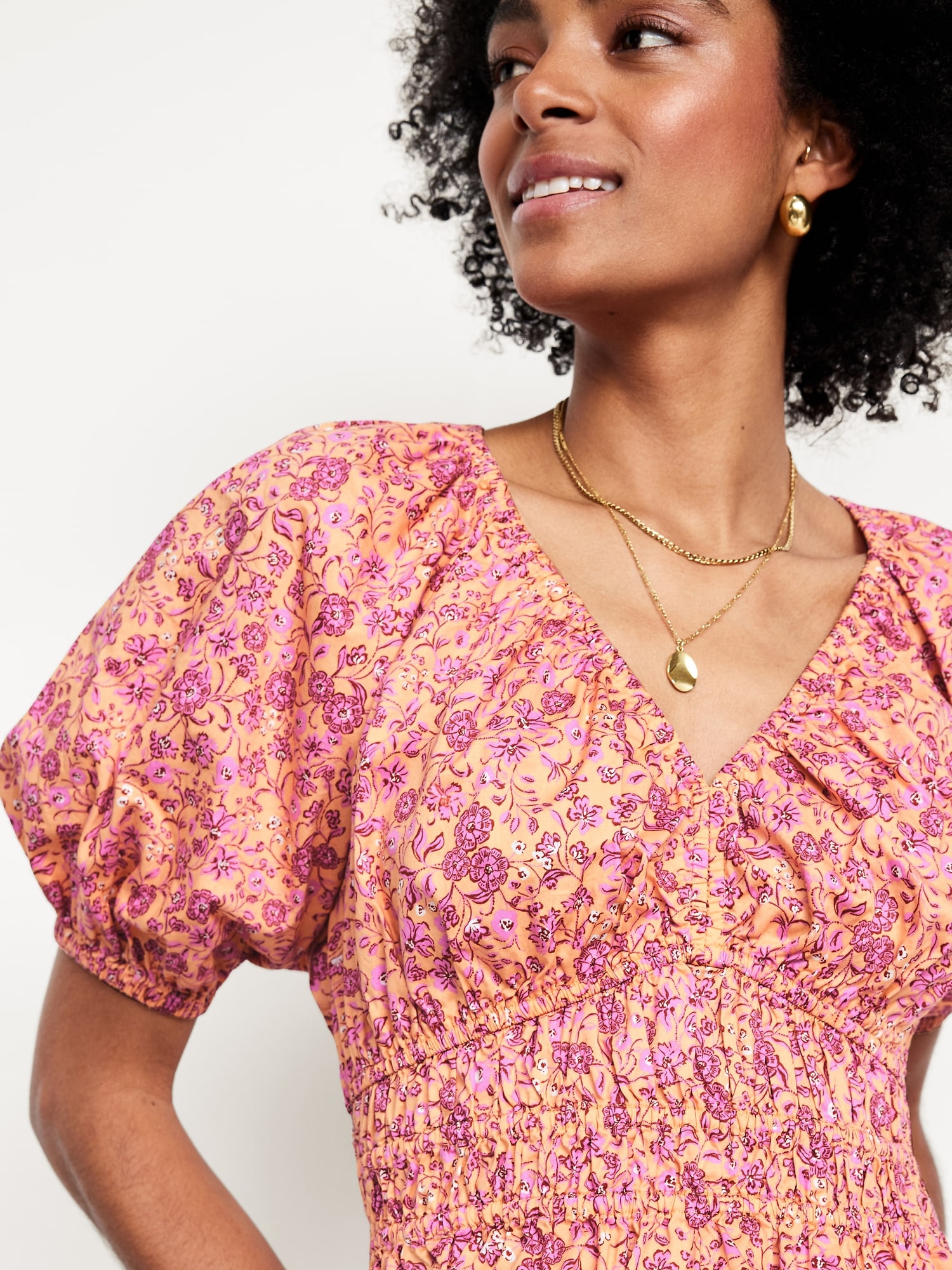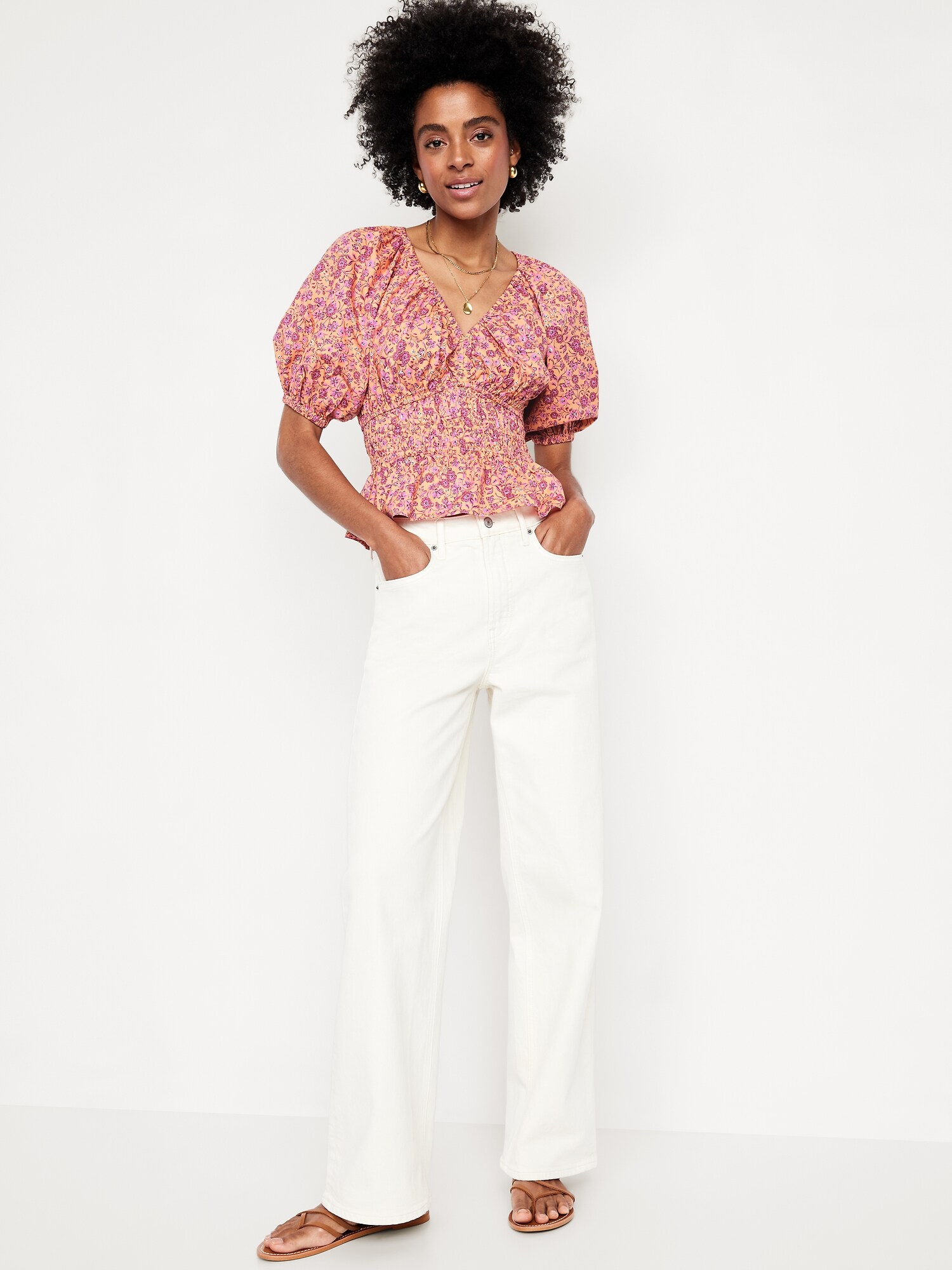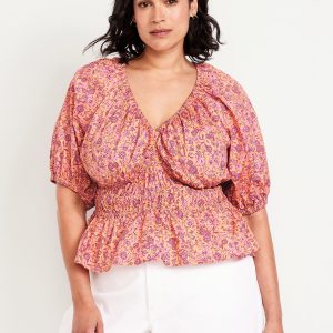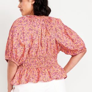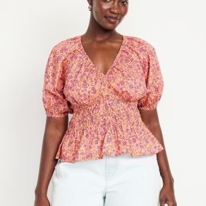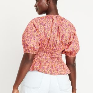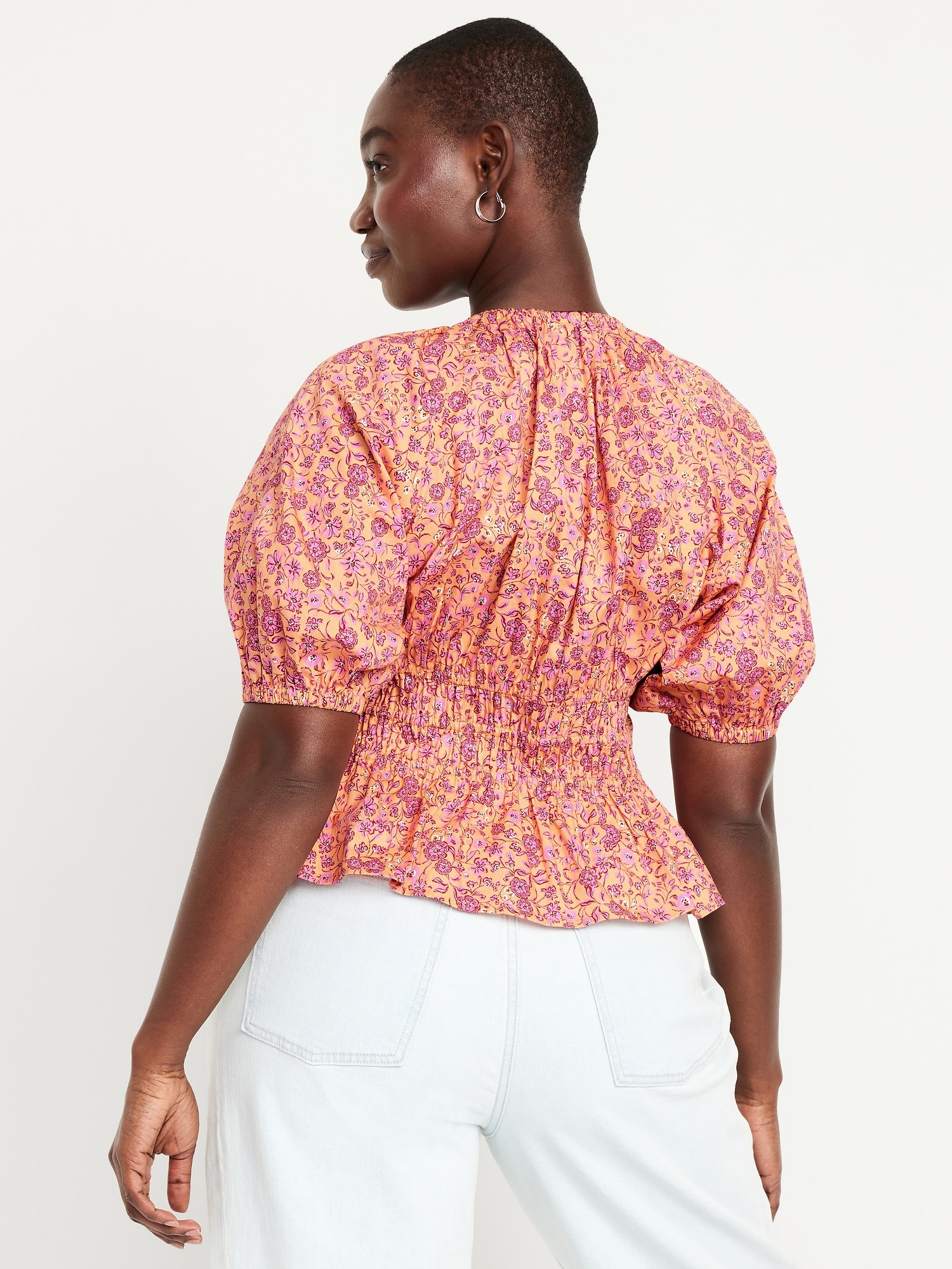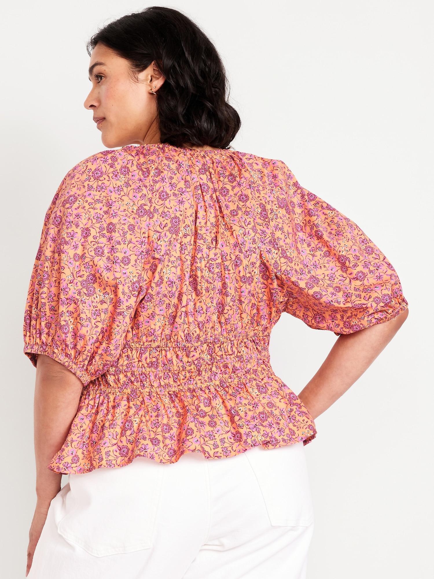 Smocked V-Neck Peplum Top: deep v-neck, elbow sleeves, elastic cuffs, smocked waist, peplum hem, gingham print, #704199