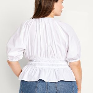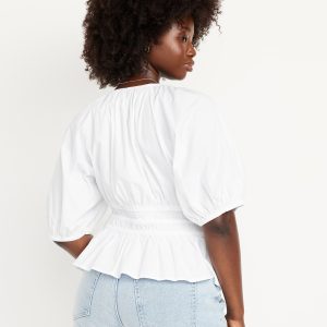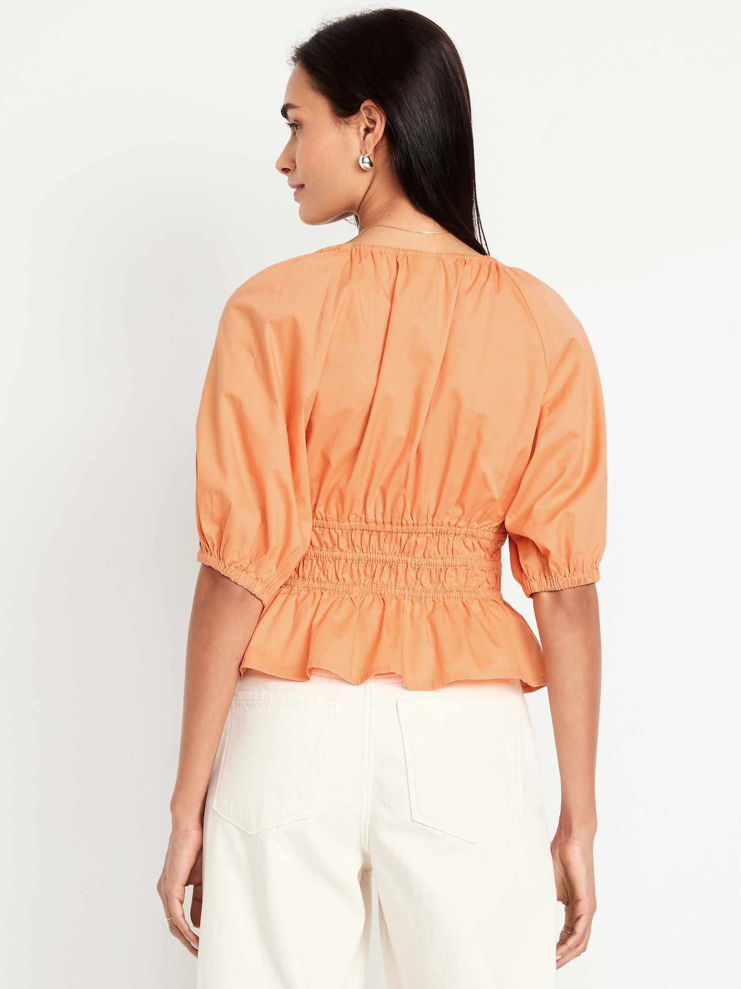 Smocked V-Neck Peplum Top: deep v-neck, elbow sleeves, elastic cuffs, smocked waist, peplum hem, gingham print, #704199