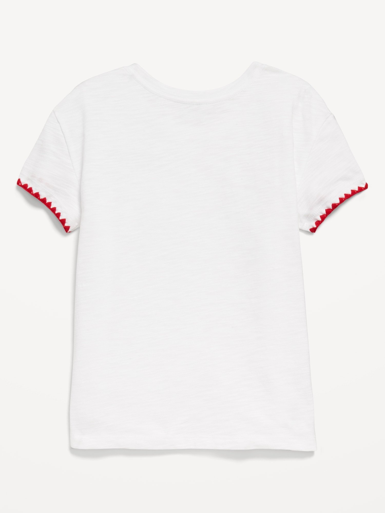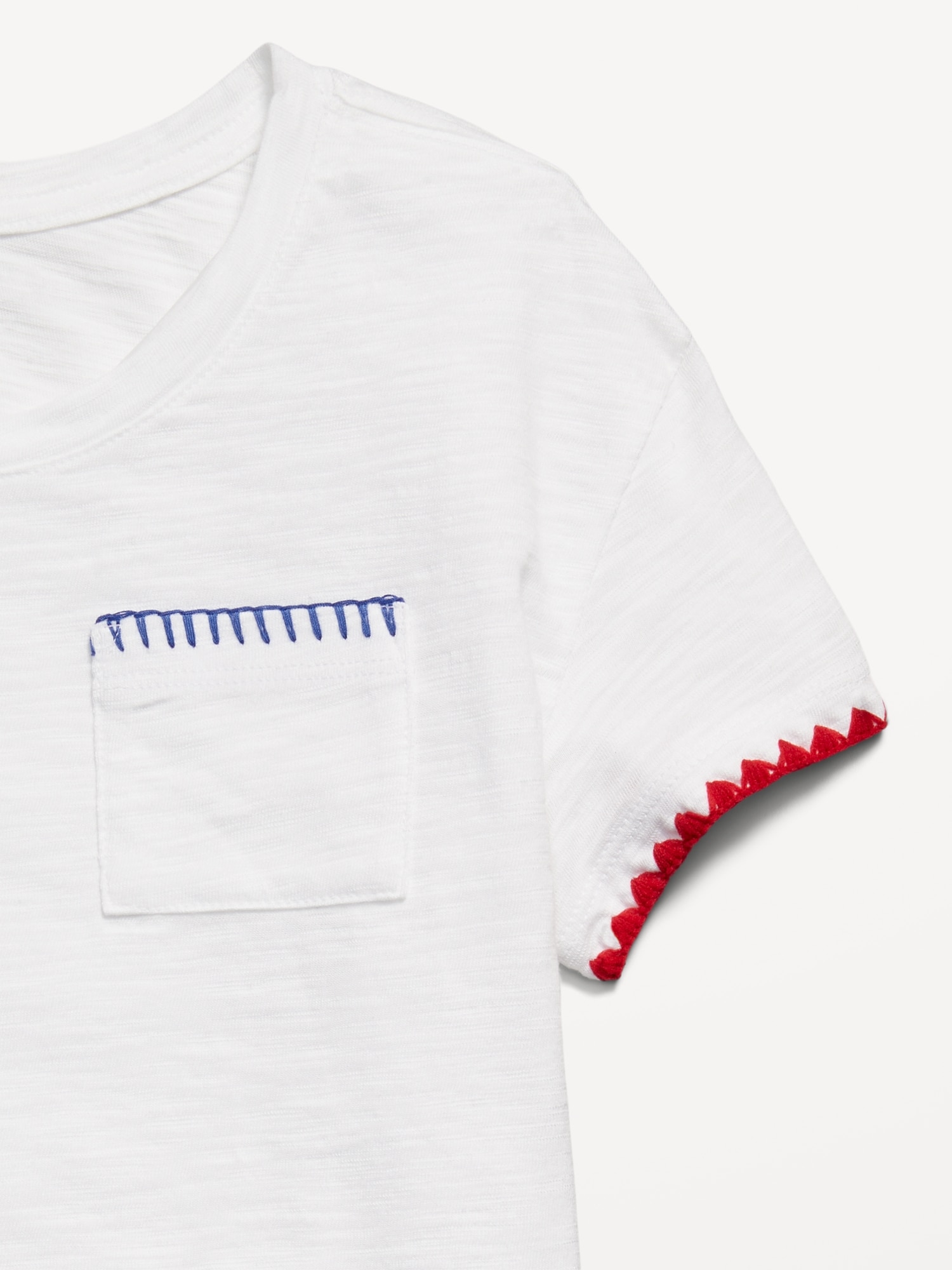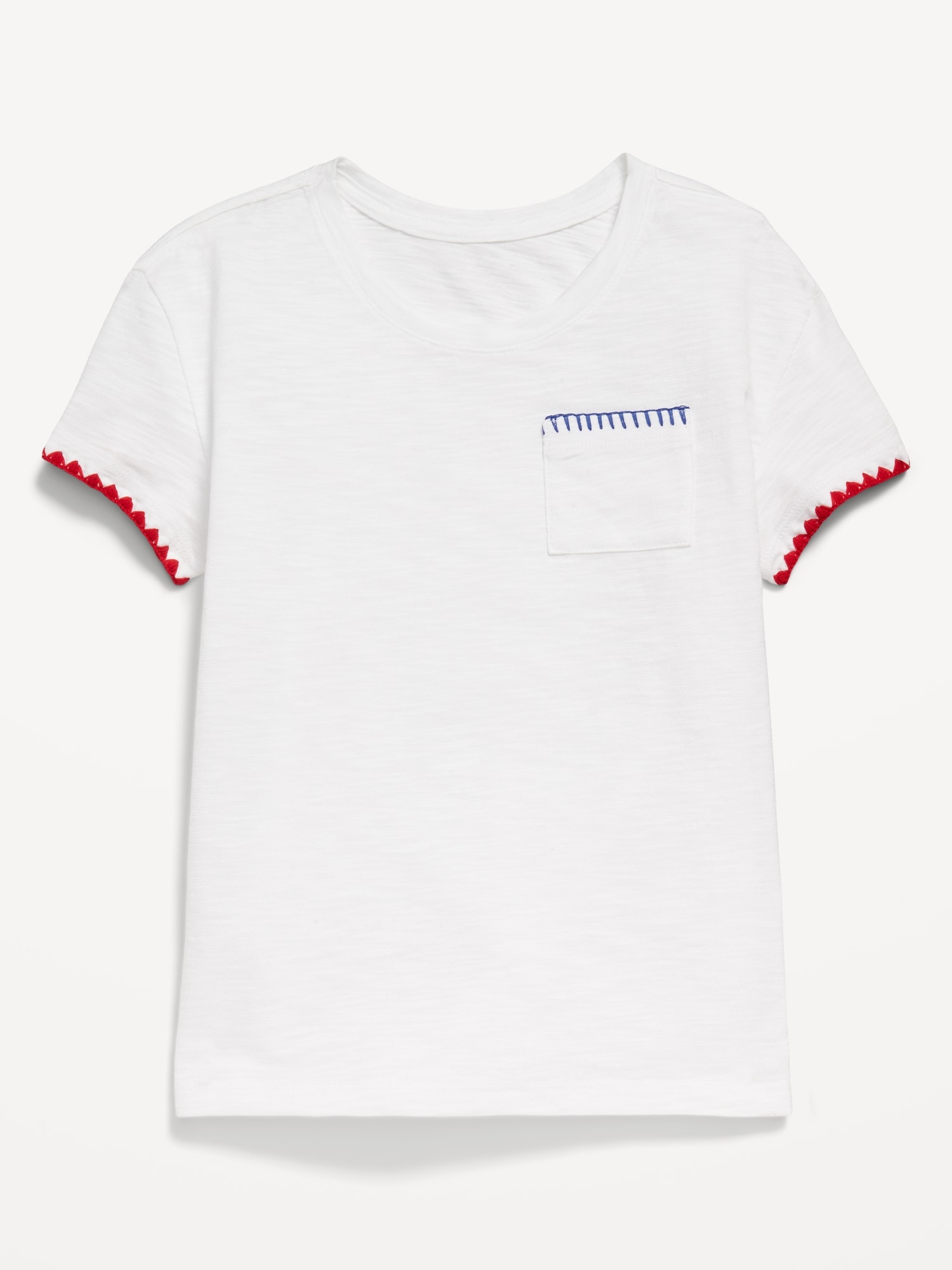 Softest Stitch-Trim Pocket T-Shirt for Girls: scoop neck, short sleeves, patch pocket at chest, contrasting stitching along pocket and sleeve cuffs, #767945