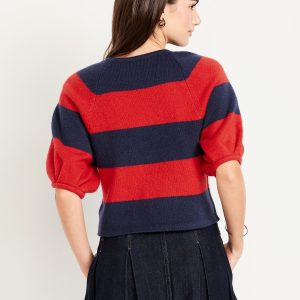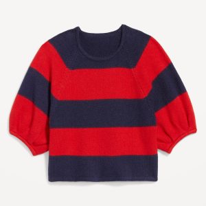SoSoft Cropped Puff-Sleeve Sweater: Featuring SoSoft. Literally “so soft” it’s got cashmere jealous.crew neck, elbow-length puff sleeves, wide contrasting stripes, #761516