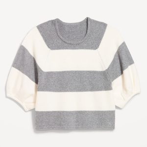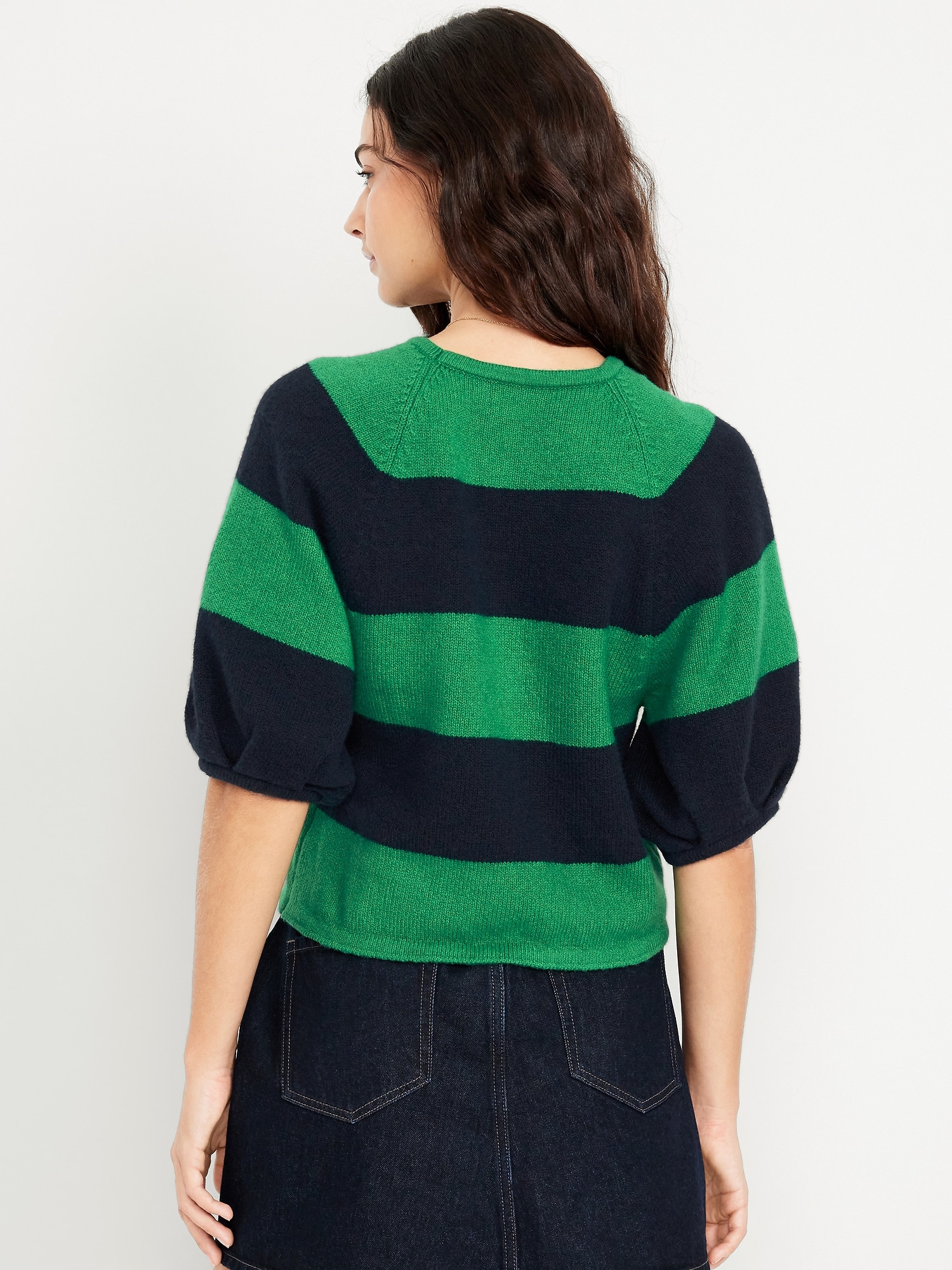 SoSoft Cropped Puff-Sleeve Sweater: Featuring SoSoft. Literally “so soft” it’s got cashmere jealous.crew neck, elbow-length puff sleeves, wide contrasting stripes, #761516