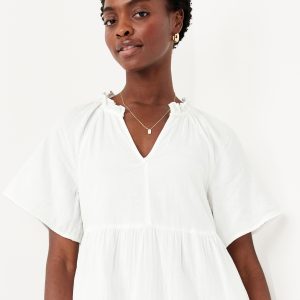 Split-Neck Crinkle Gauze Mini Swing Dress: A light, rippled fabric that’s begging to be beachside.ruffled split v-neck, short flutter sleeves, hip pockets, shirred detail, mini length, #705169