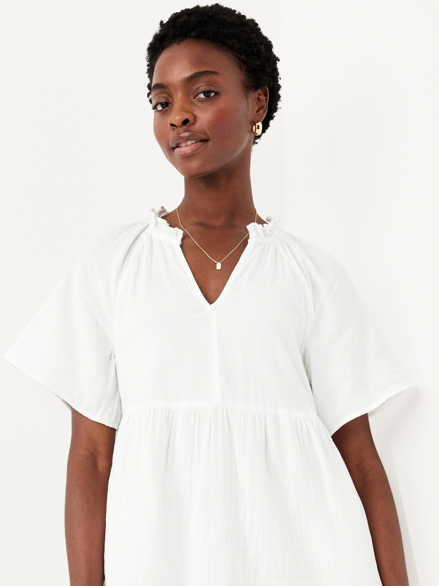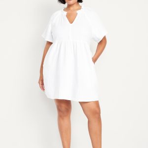 Split-Neck Crinkle Gauze Mini Swing Dress
