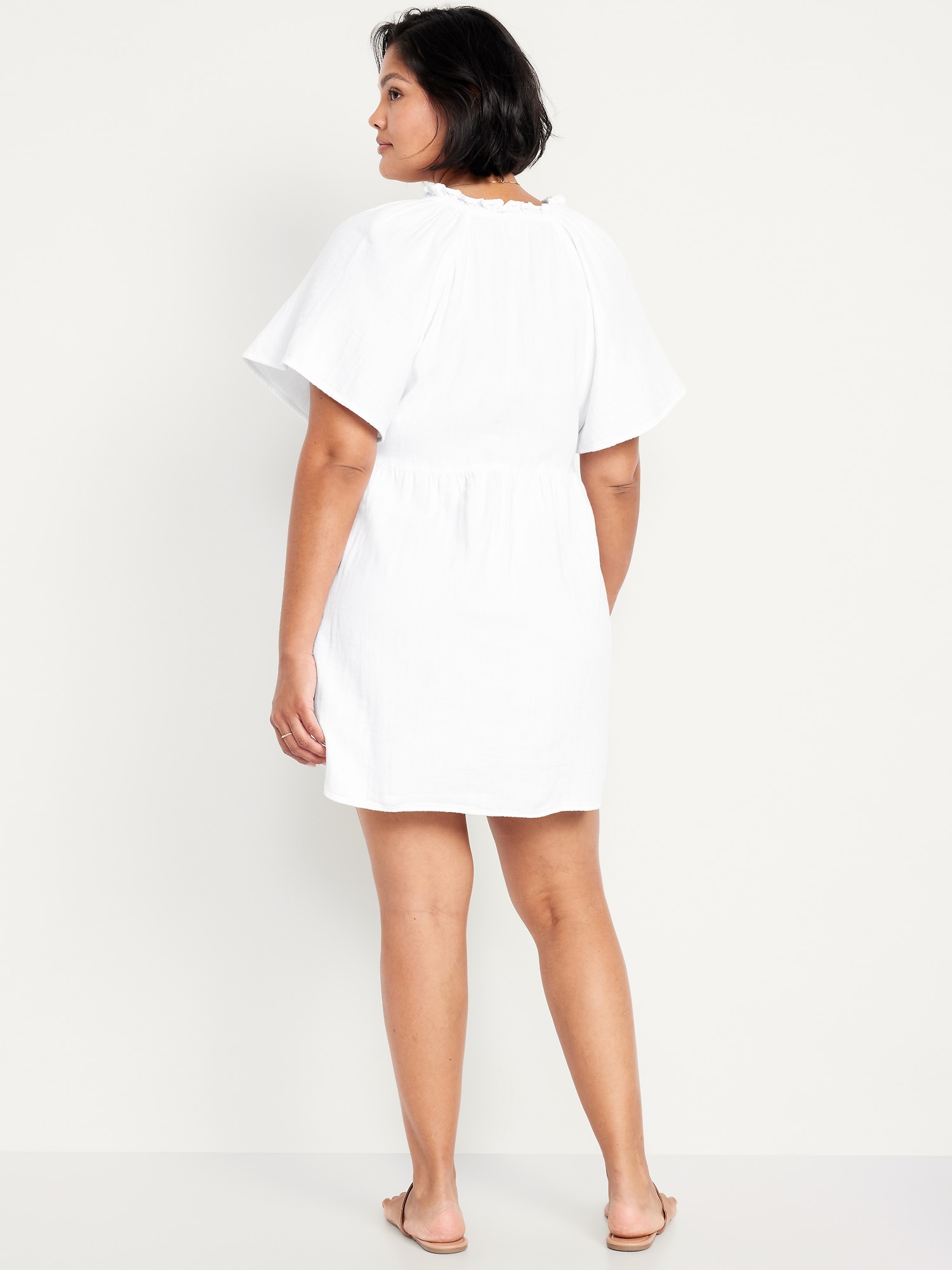 Split-Neck Crinkle Gauze Mini Swing Dress: A light, rippled fabric that’s begging to be beachside.ruffled split v-neck, short flutter sleeves, hip pockets, shirred detail, mini length, #705169