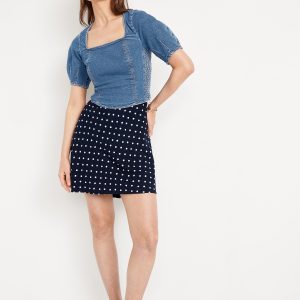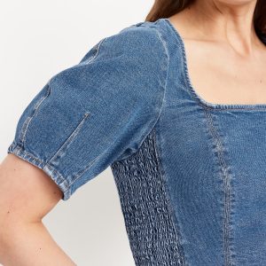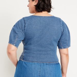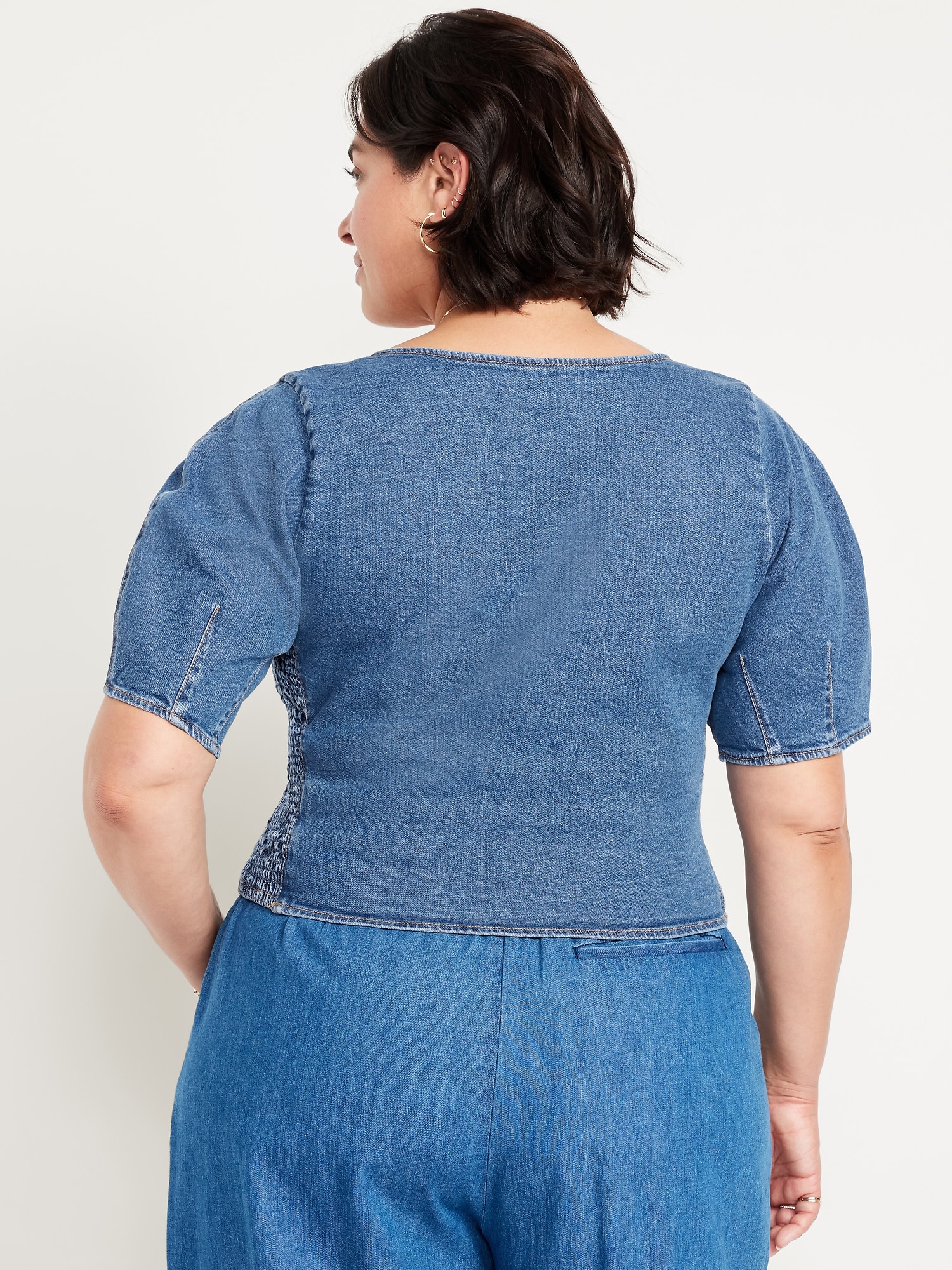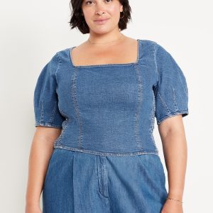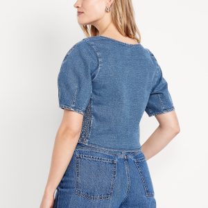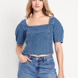 Square-Neck Denim Crop Top: square neck, short puff sleeves, smocked side panels, seamed front, #805746