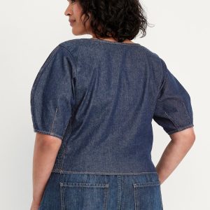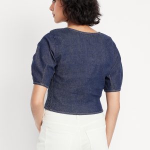 Square-Neck Denim Crop Top: square neck, short puff sleeves, smocked side panels, seamed front, #805746