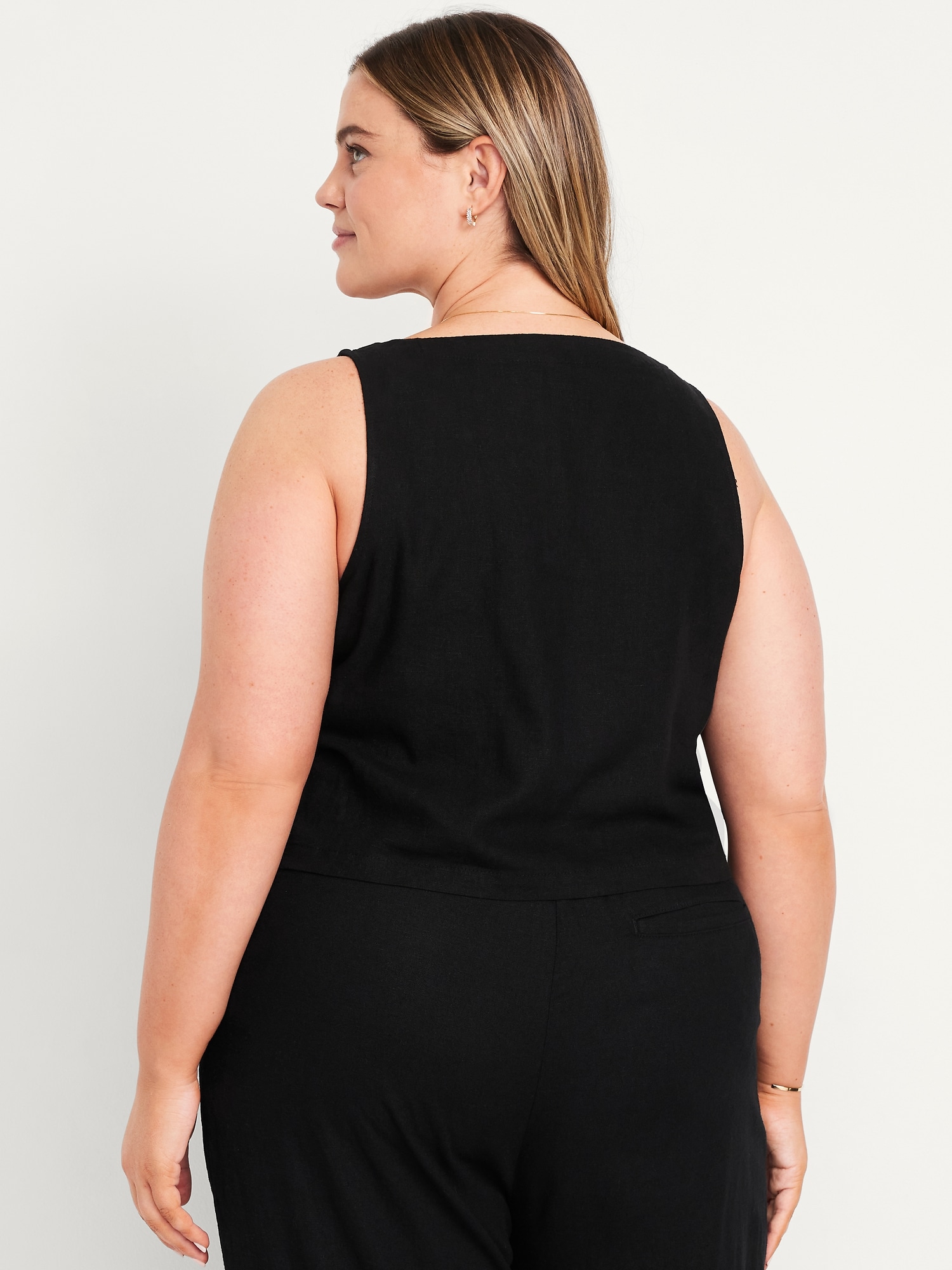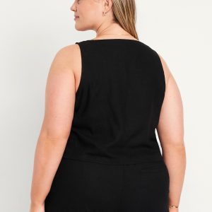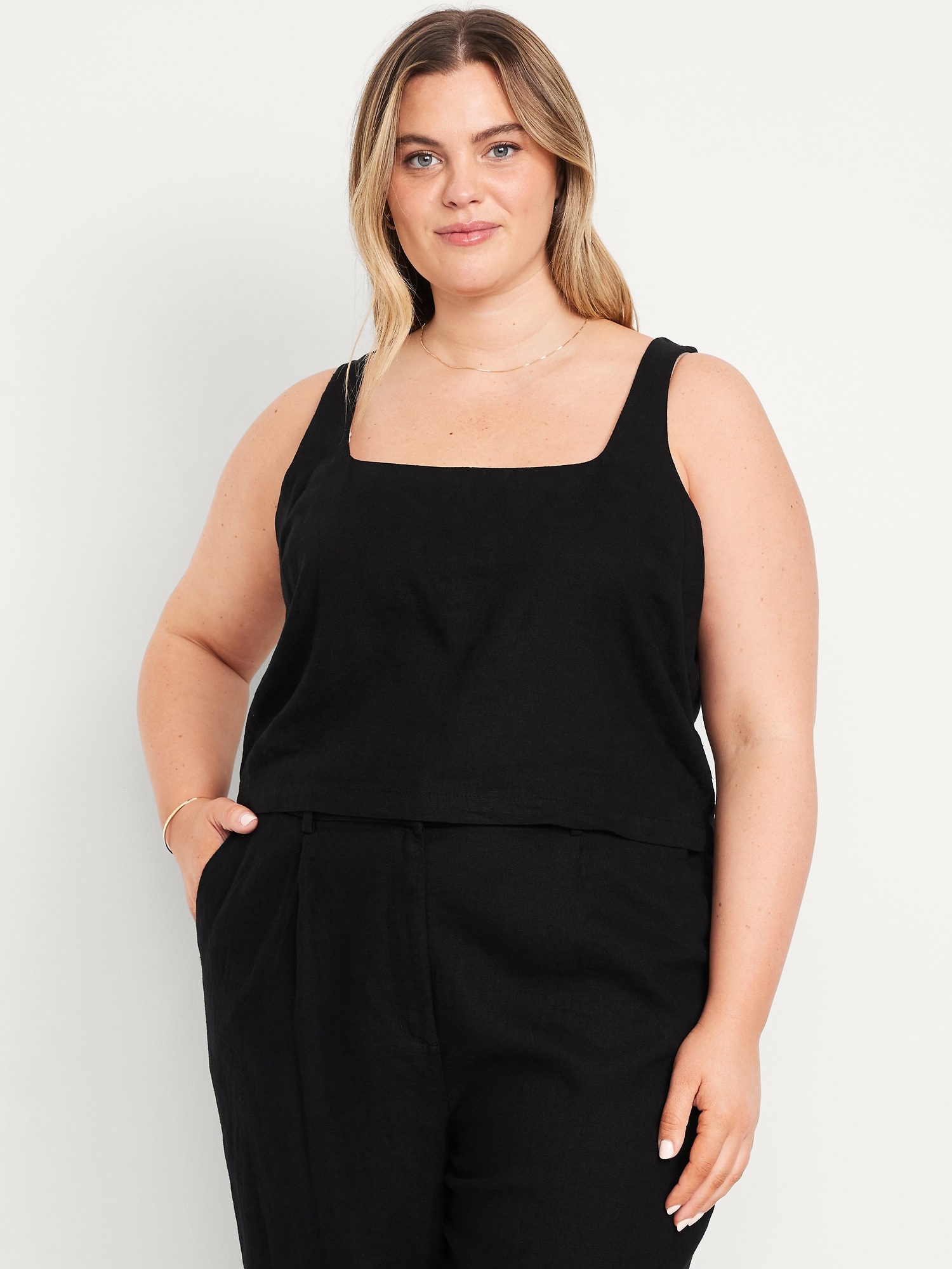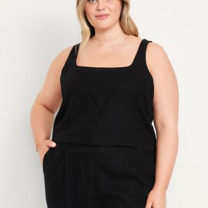 Square-Neck Linen-Blend Crop Tank Top: square neck, sleeveless, darted bust, #756733
