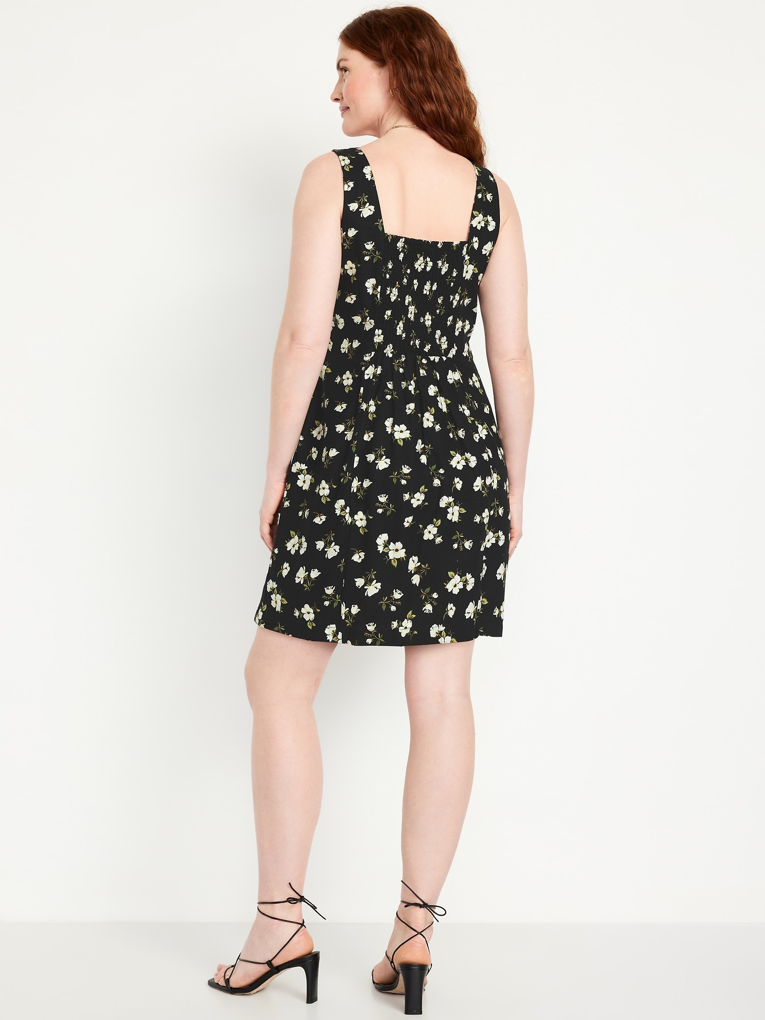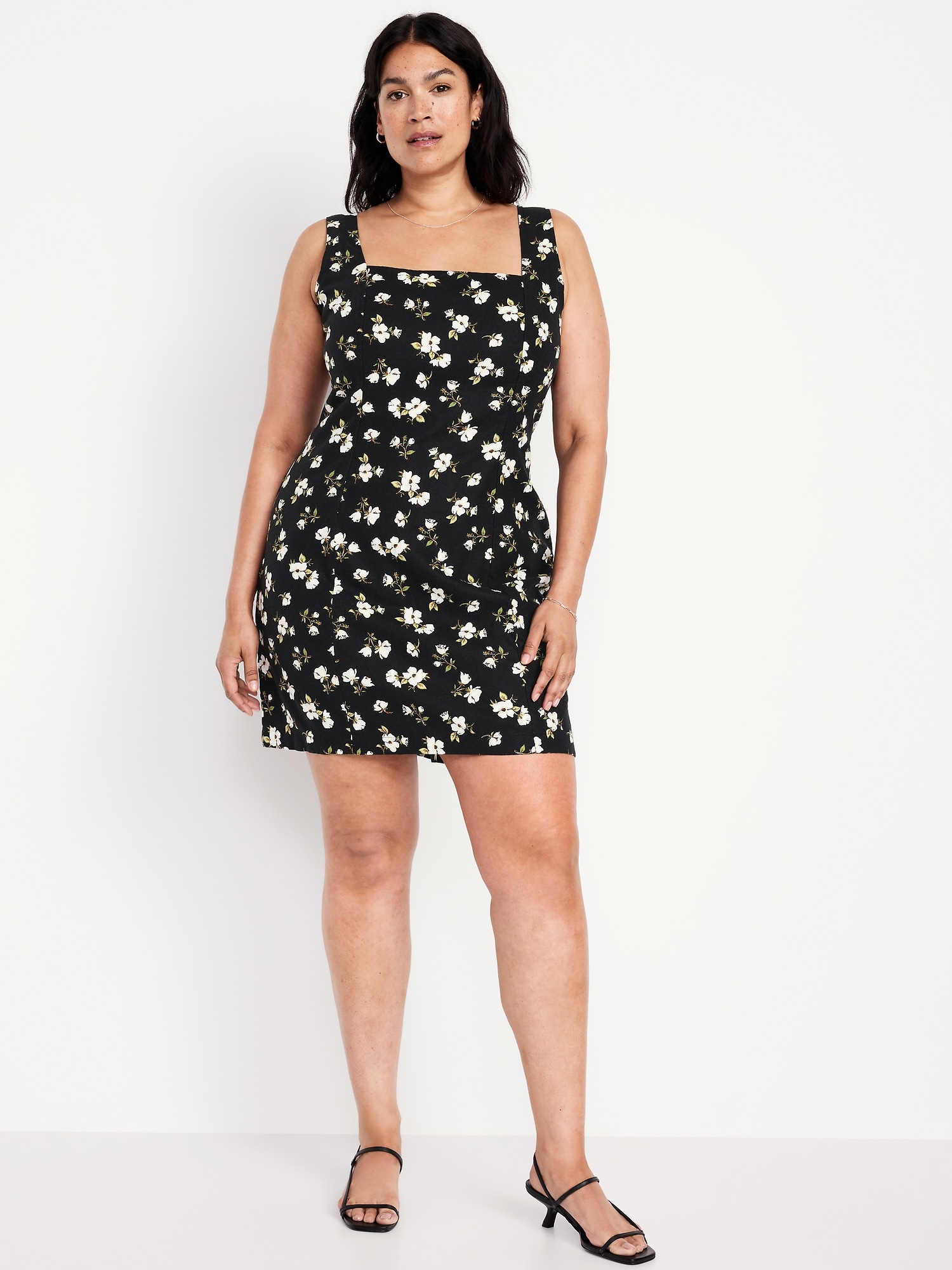Square-Neck Linen-Blend Floral Mini Dress: square neck, wide straps, smocked back, princess seams, mini length, gingham print, #708450