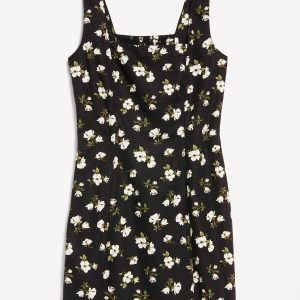 Square-Neck Linen-Blend Floral Mini Dress: square neck, wide straps, smocked back, princess seams, mini length, gingham print, #708450