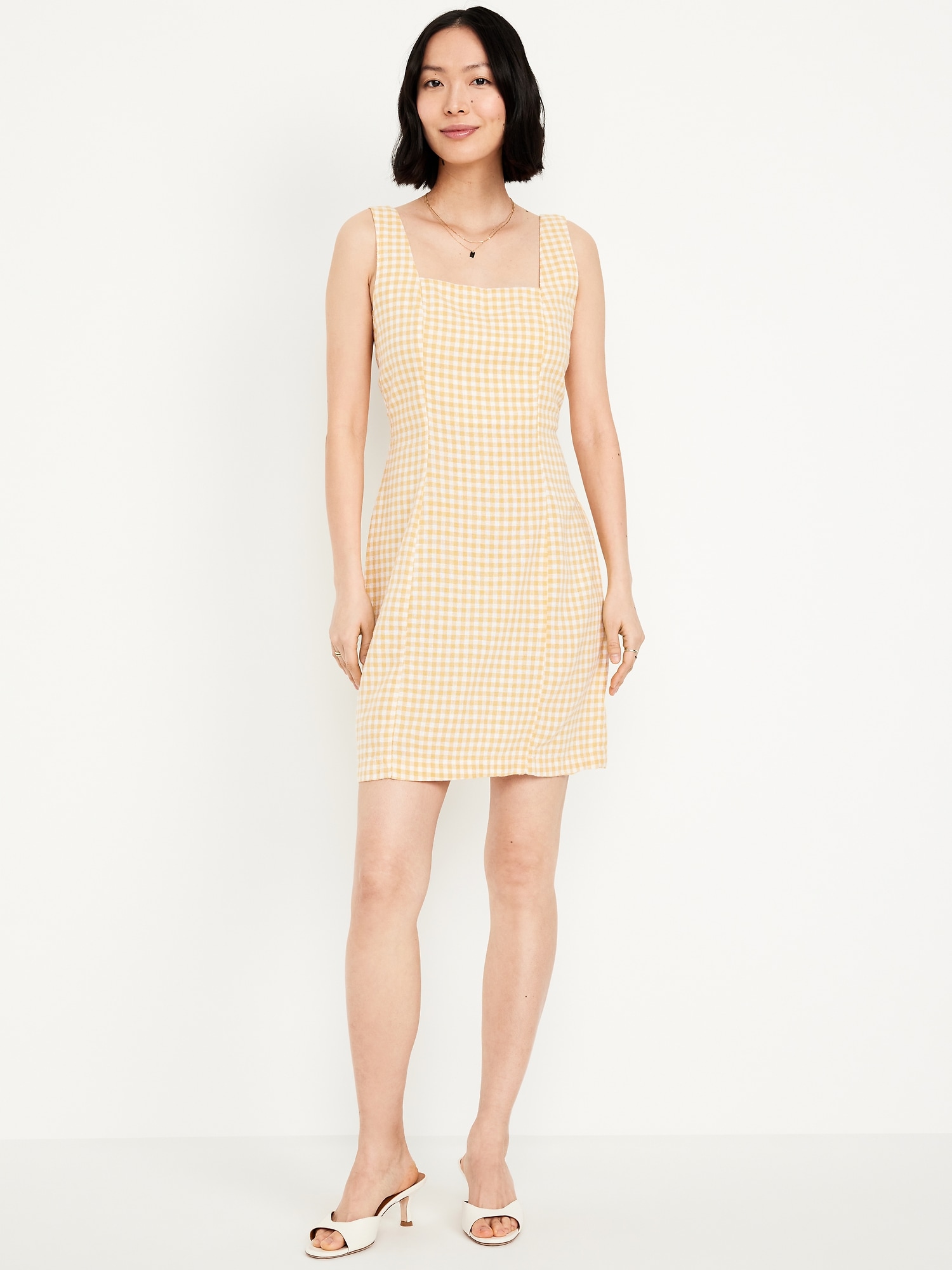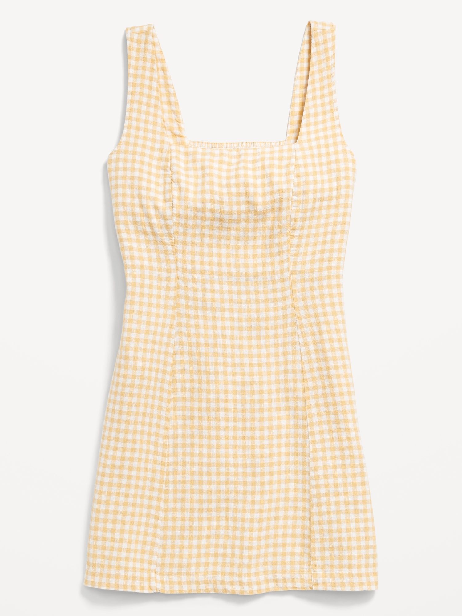 Square-Neck Linen-Blend Mini Dress: square neck, wide straps, smocked back, princess seams, mini length, gingham print, #708450