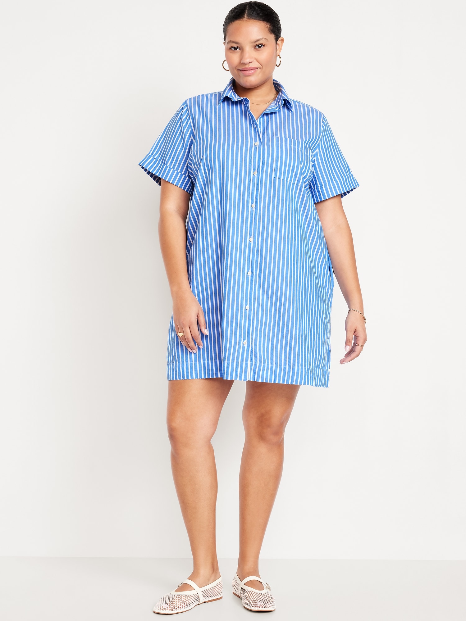 Striped Mini Shirt Dress: spread collar, short sleeves, side-seam pockets, patch chest pocket, full-button front, #705355