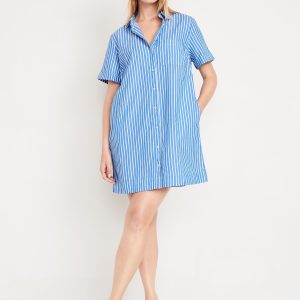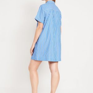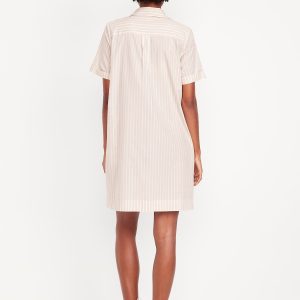 Striped Mini Shirt Dress: spread collar, short sleeves, side-seam pockets, patch chest pocket, full-button front, #705355