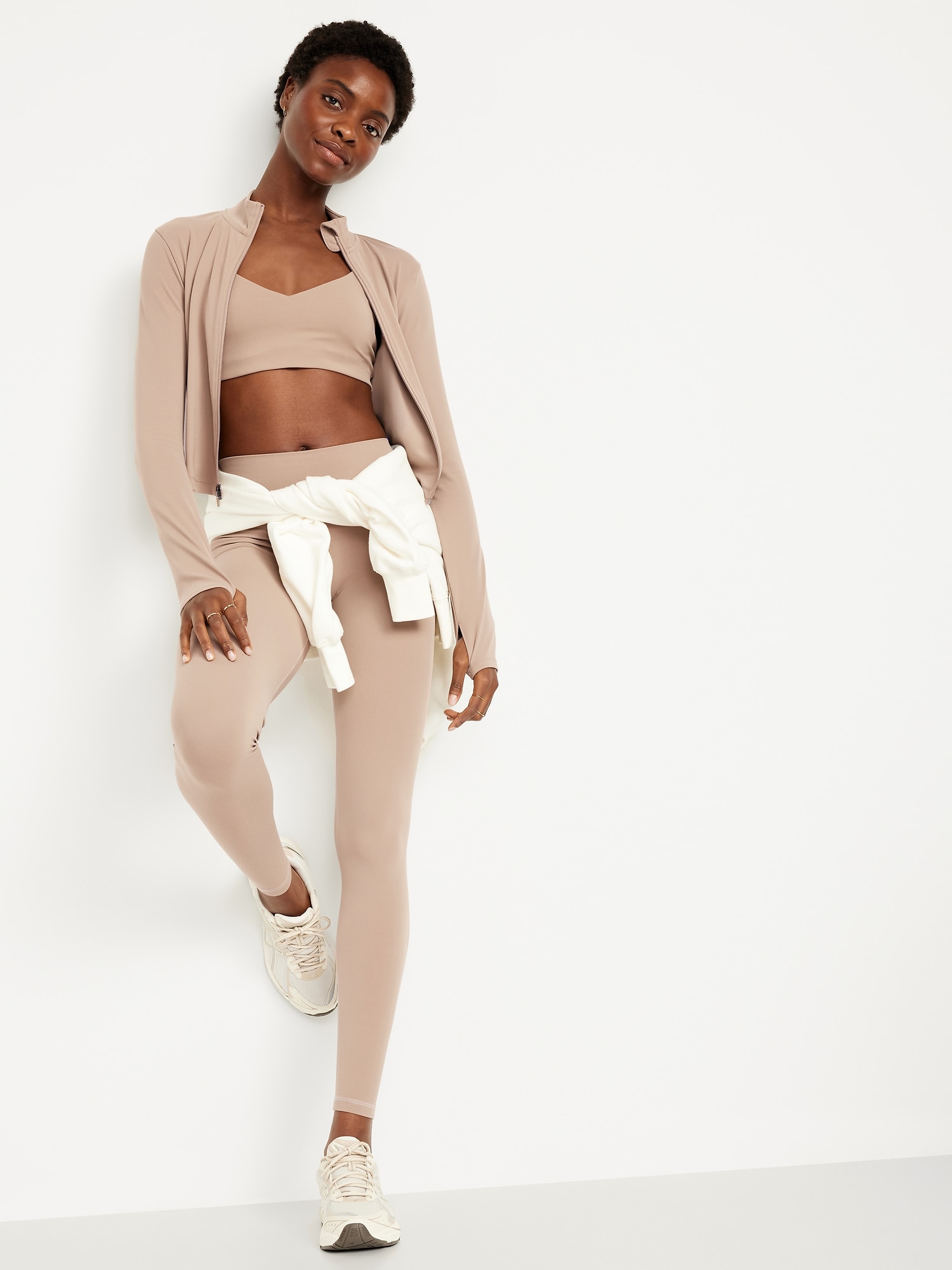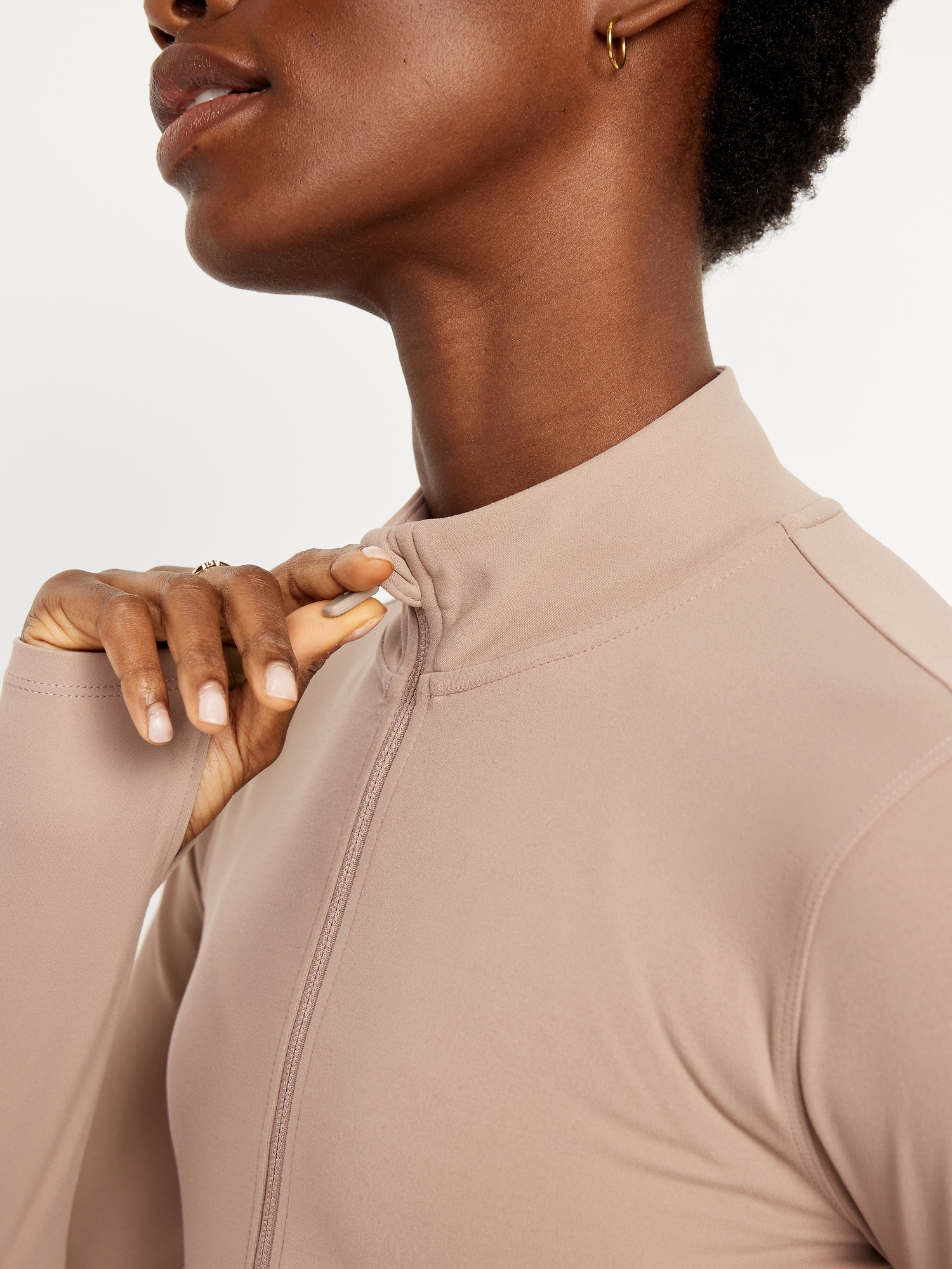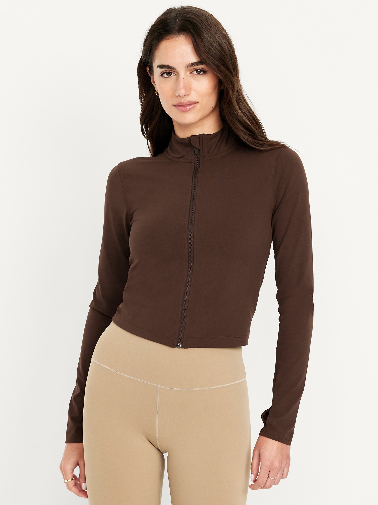 StudioSmooth Crop Full Zip: Featuring StudioSmooth. Buttery soft and breathable, with a barely-there feel.mock neck, long sleeves, thumbhole cuffs, zip front, go-dry wicks moisture, #663729