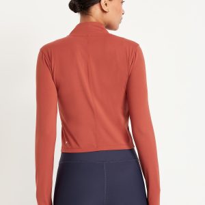 StudioSmooth Crop Full Zip: Featuring StudioSmooth. Buttery soft and breathable, with a barely-there feel.mock neck, long sleeves, thumbhole cuffs, zip front, go-dry wicks moisture, #663729
