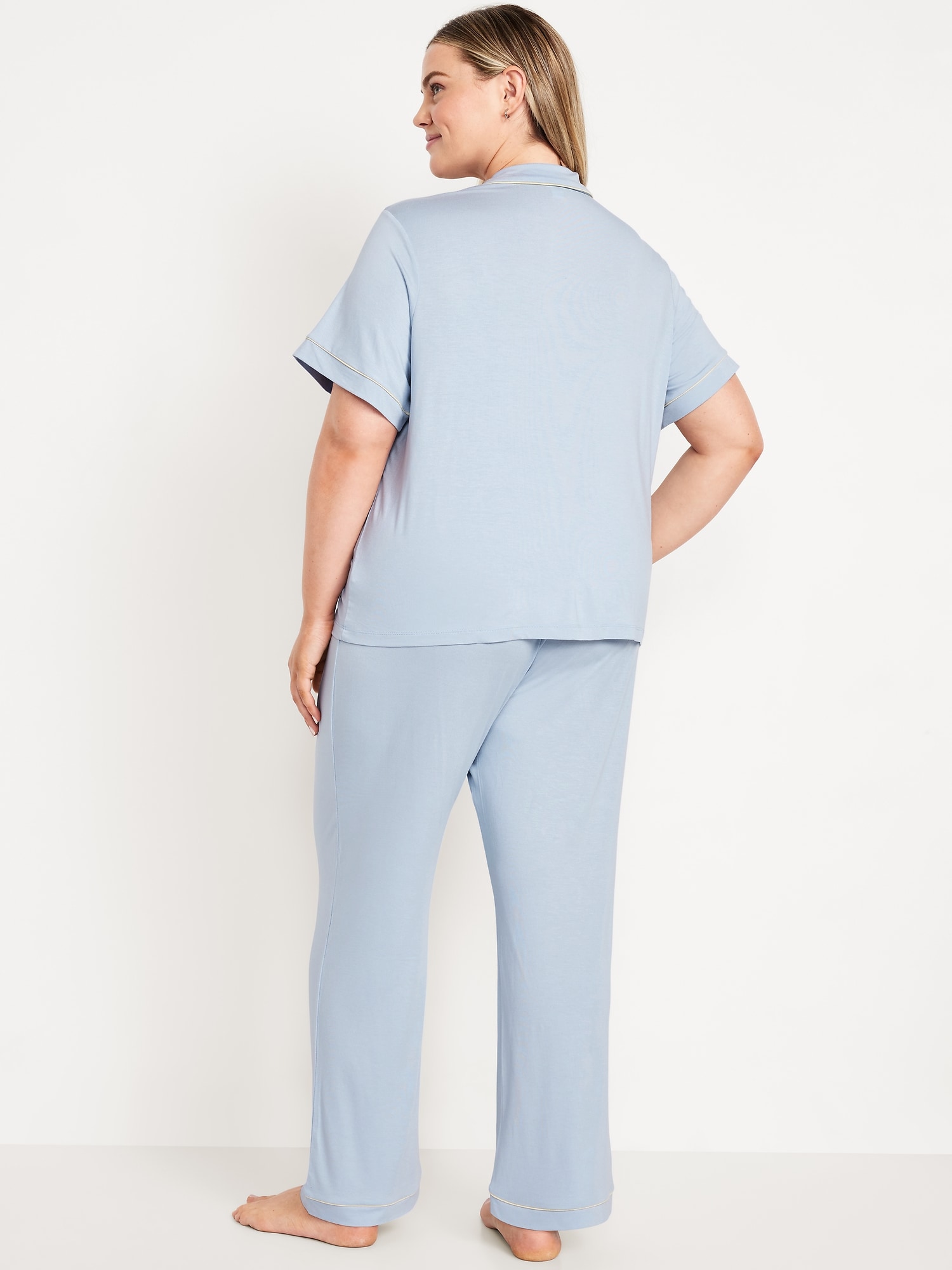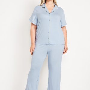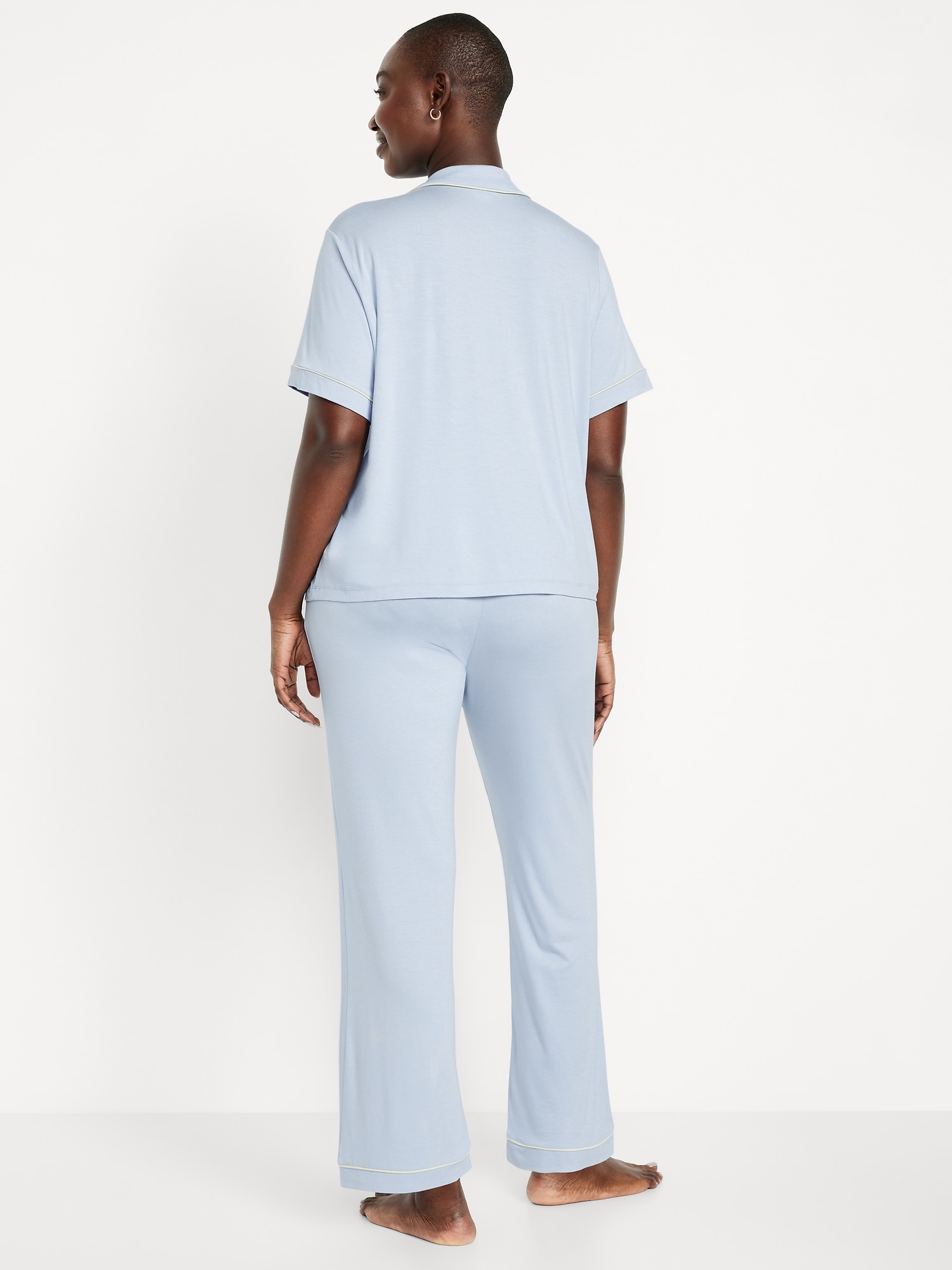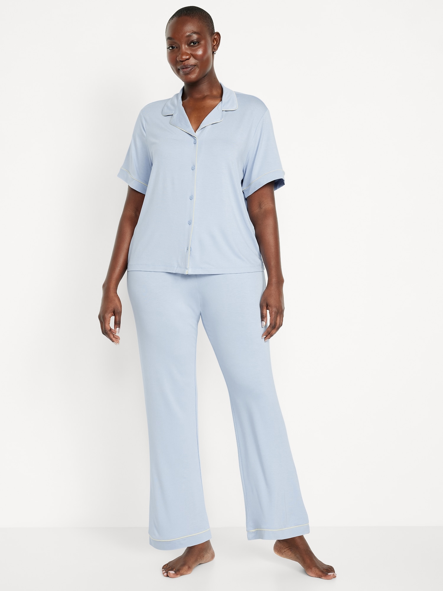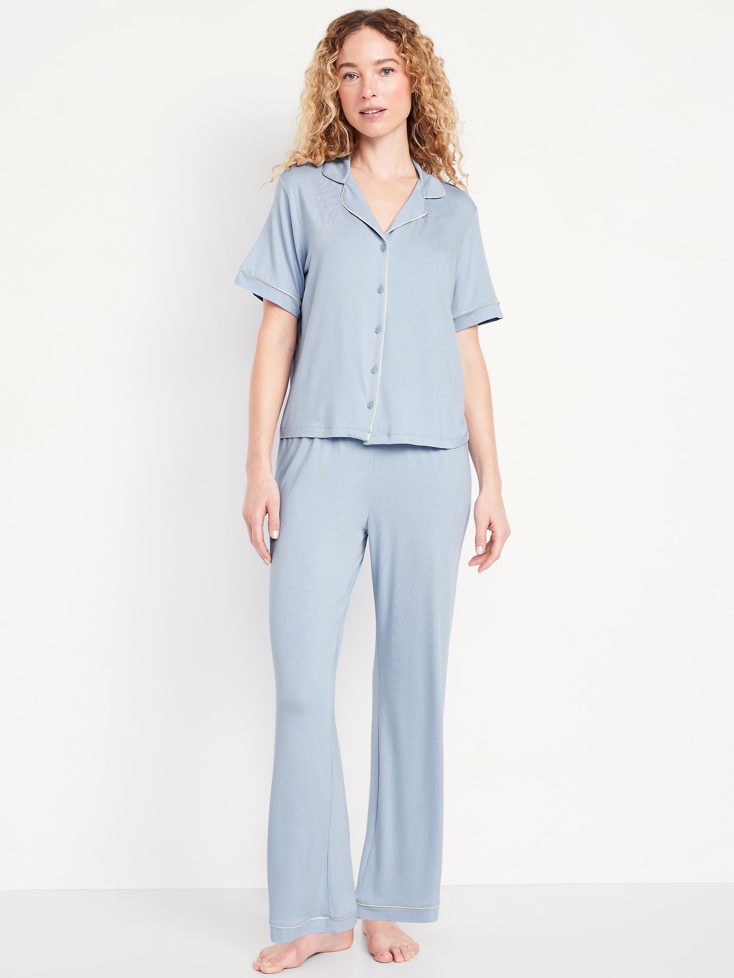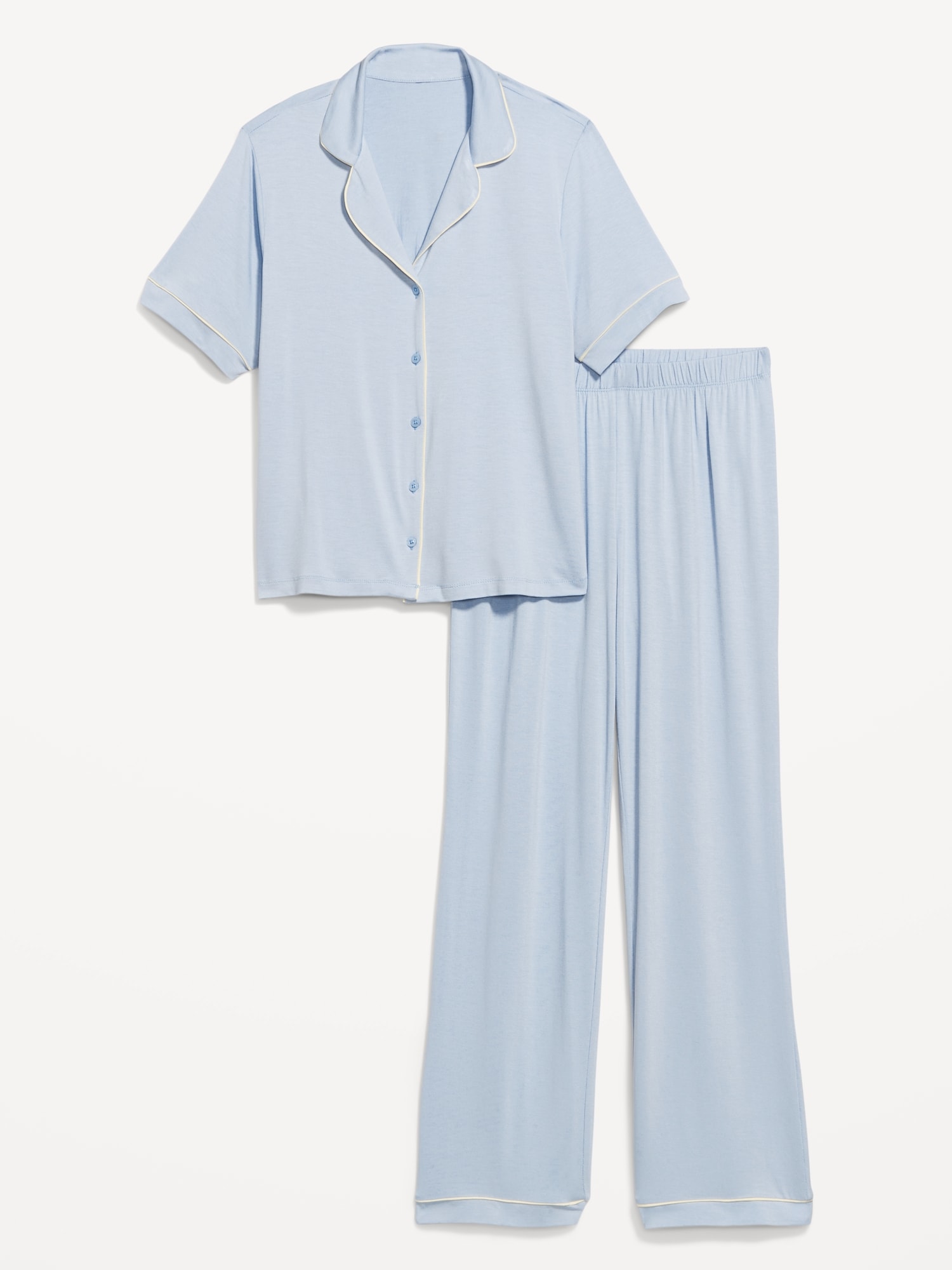 Sunday Sleep Knit Jersey Pant Set: set includes pajama shirt and matching bottoms, notched collar, short sleeves, button front, elastic-waist pajama pants with piping at hem, striped print, #808325