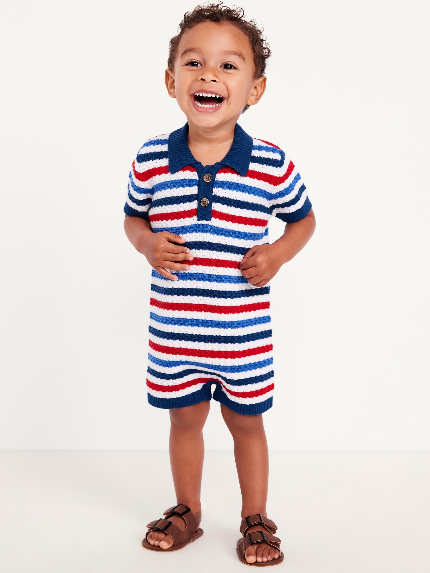 Sweater-Knit Polo One-Piece Romper for Baby: spread collar, two-button placket, short sleeves, hidden snaps along inseam, all-over stripes, #762091