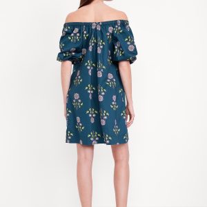 Textured-Dobby Mini Swing Dress: elastic neckline can be worn on or off shoulder, elbow-length puff sleeves, on-seam pockets, mini length, striped print, #766924
