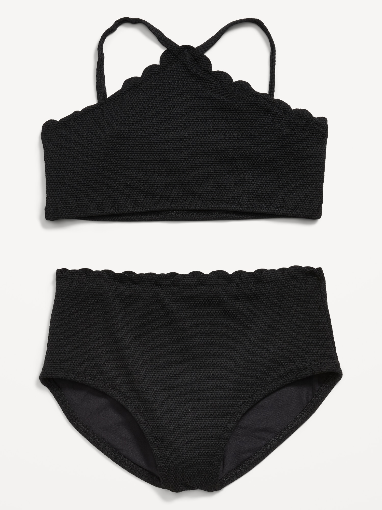 Textured Strappy Halter Bikini Swim Set for Girls: scoop neck, wide shoulder straps, tie-knot at hem, matching bikini swim bottoms, elasticized waist and leg openings, all-over print, #660307
