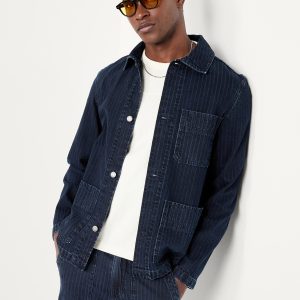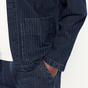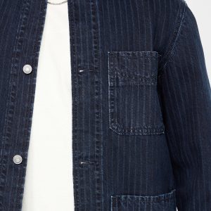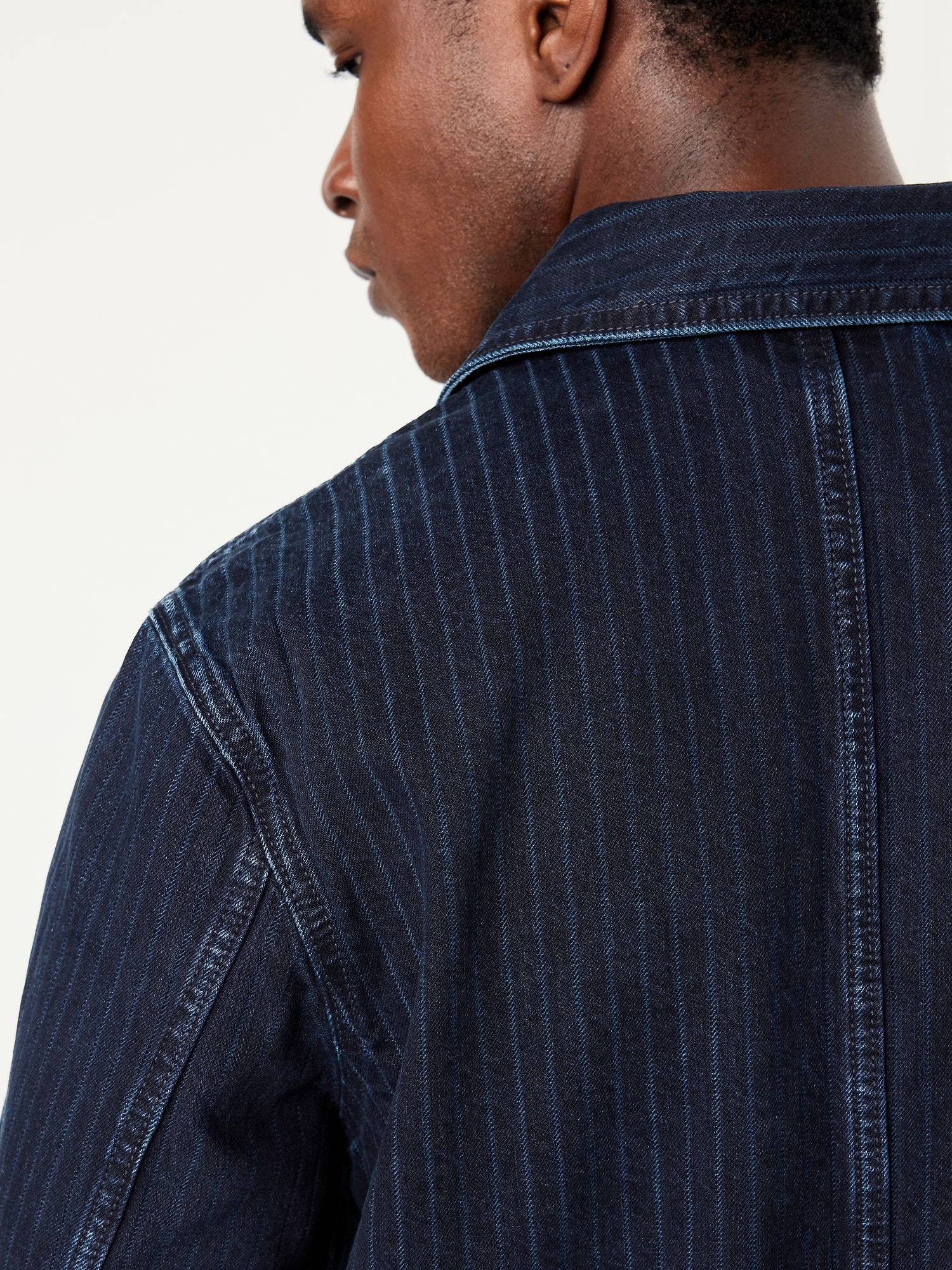 Textured-Stripe Denim Chore Jacket: spread collar, long sleeves, four-button front, chest patch pocket, front patch pockets, #800286