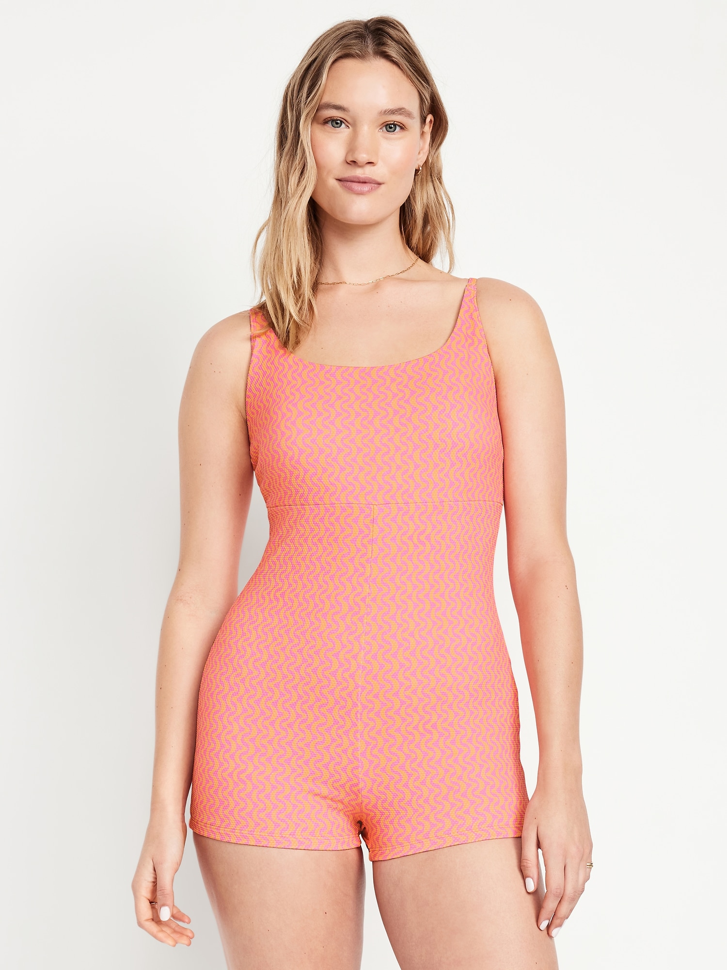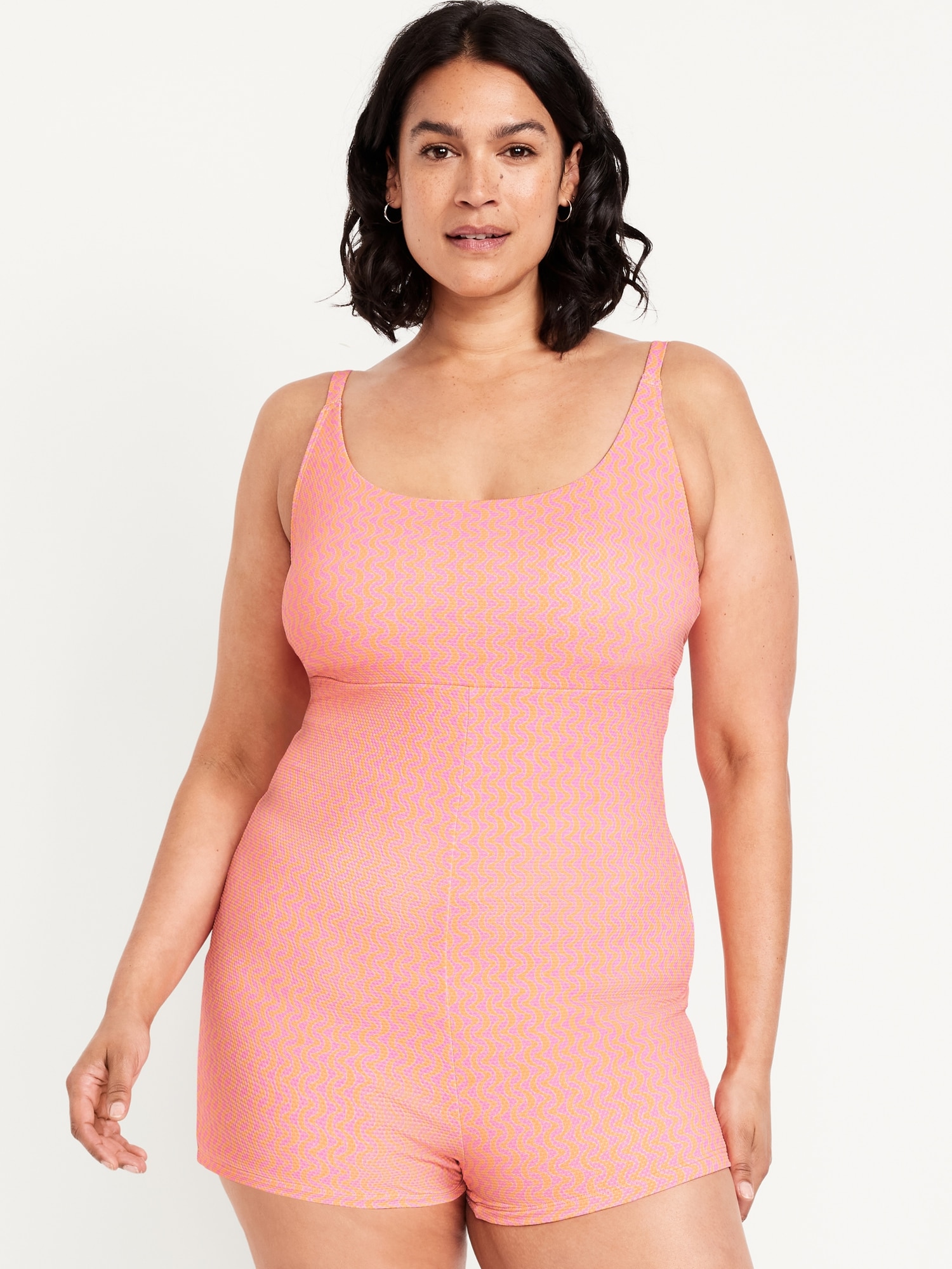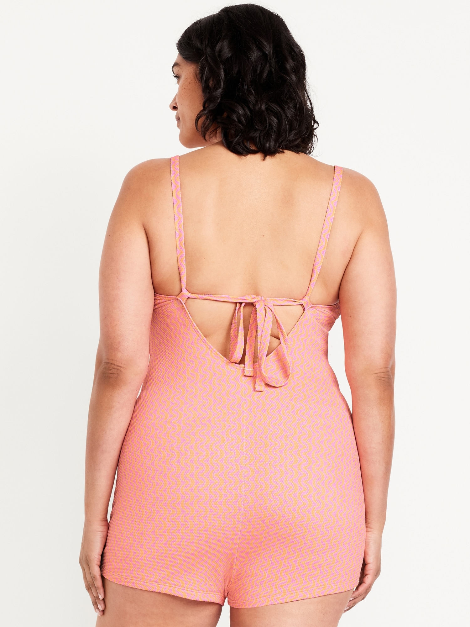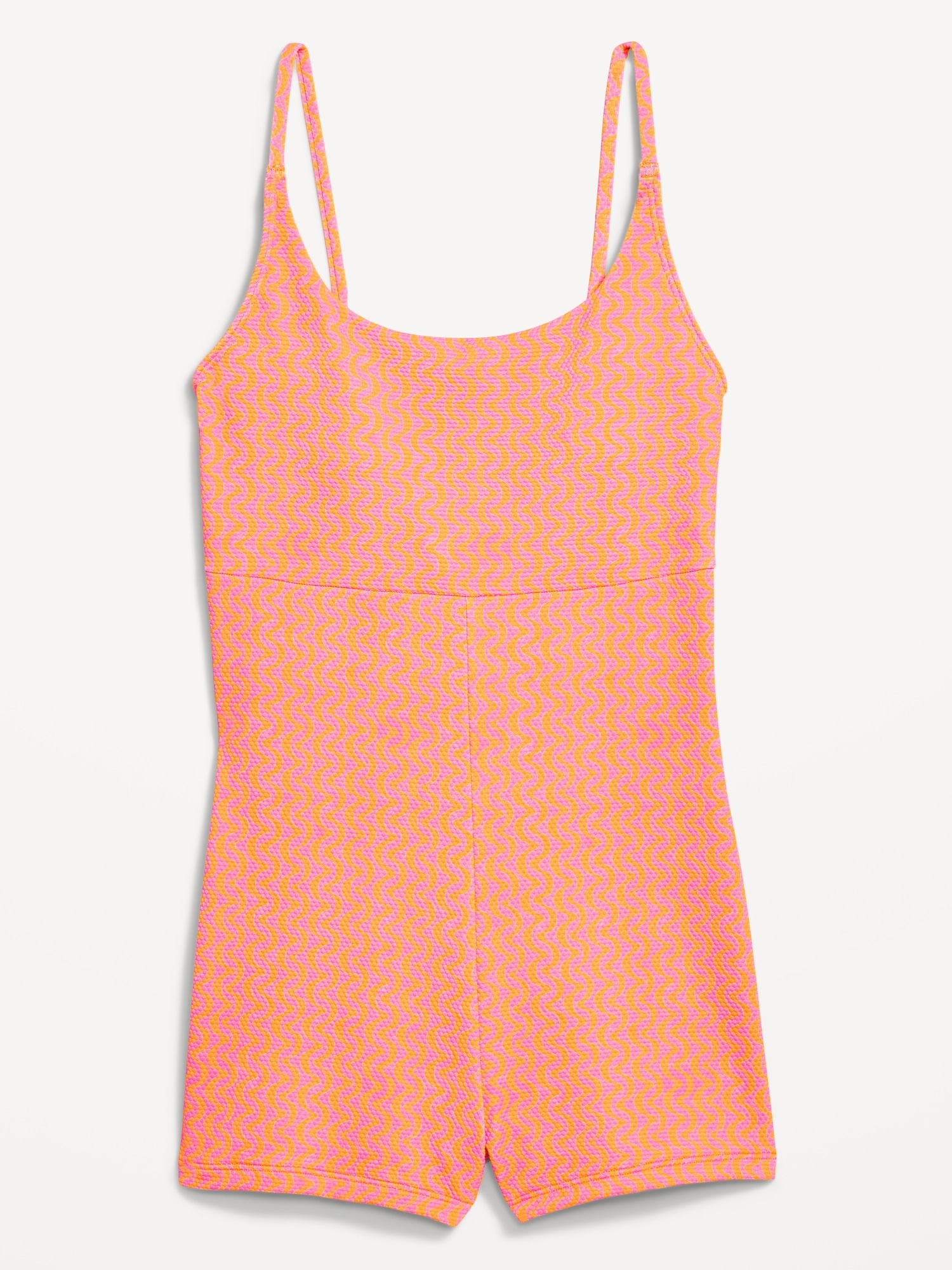 Textured Swim Romper — 2.5-inch inseam: scoop neck, spaghetti straps, seamed waist, #892291