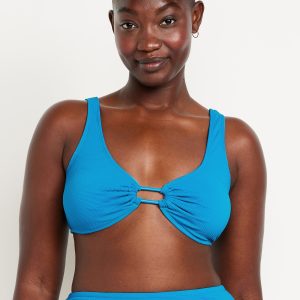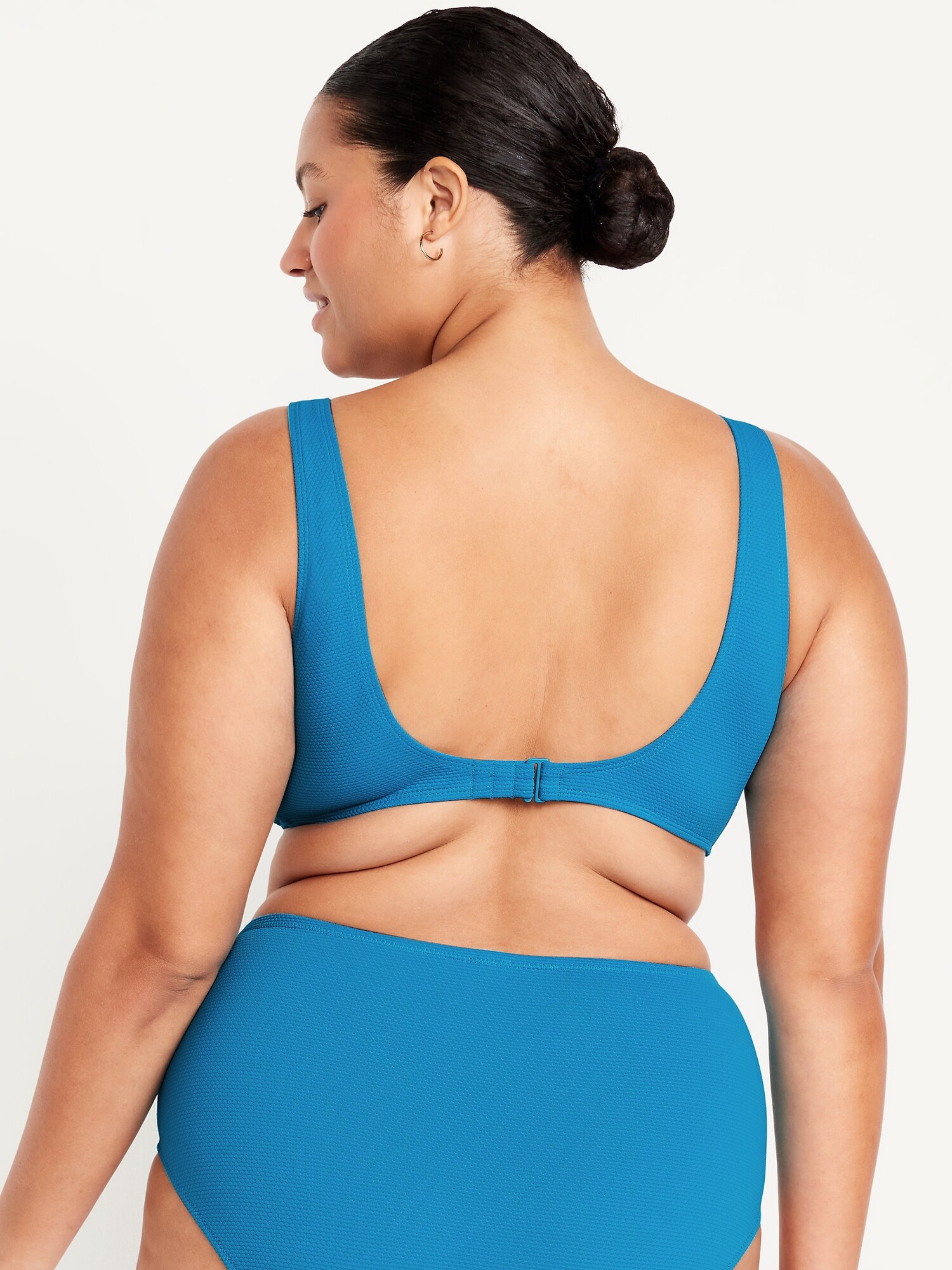 Textured Swim Top: scoop neck, wide straps, ruched front with o-ring accent, removable cups, hook-and-eye clasp at back, #660878