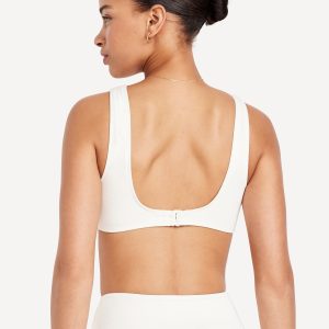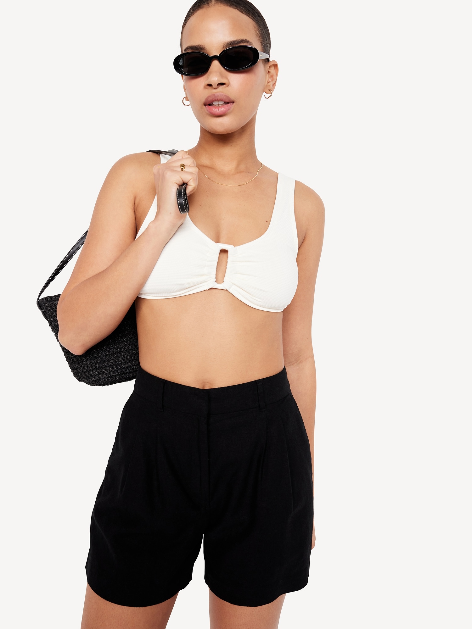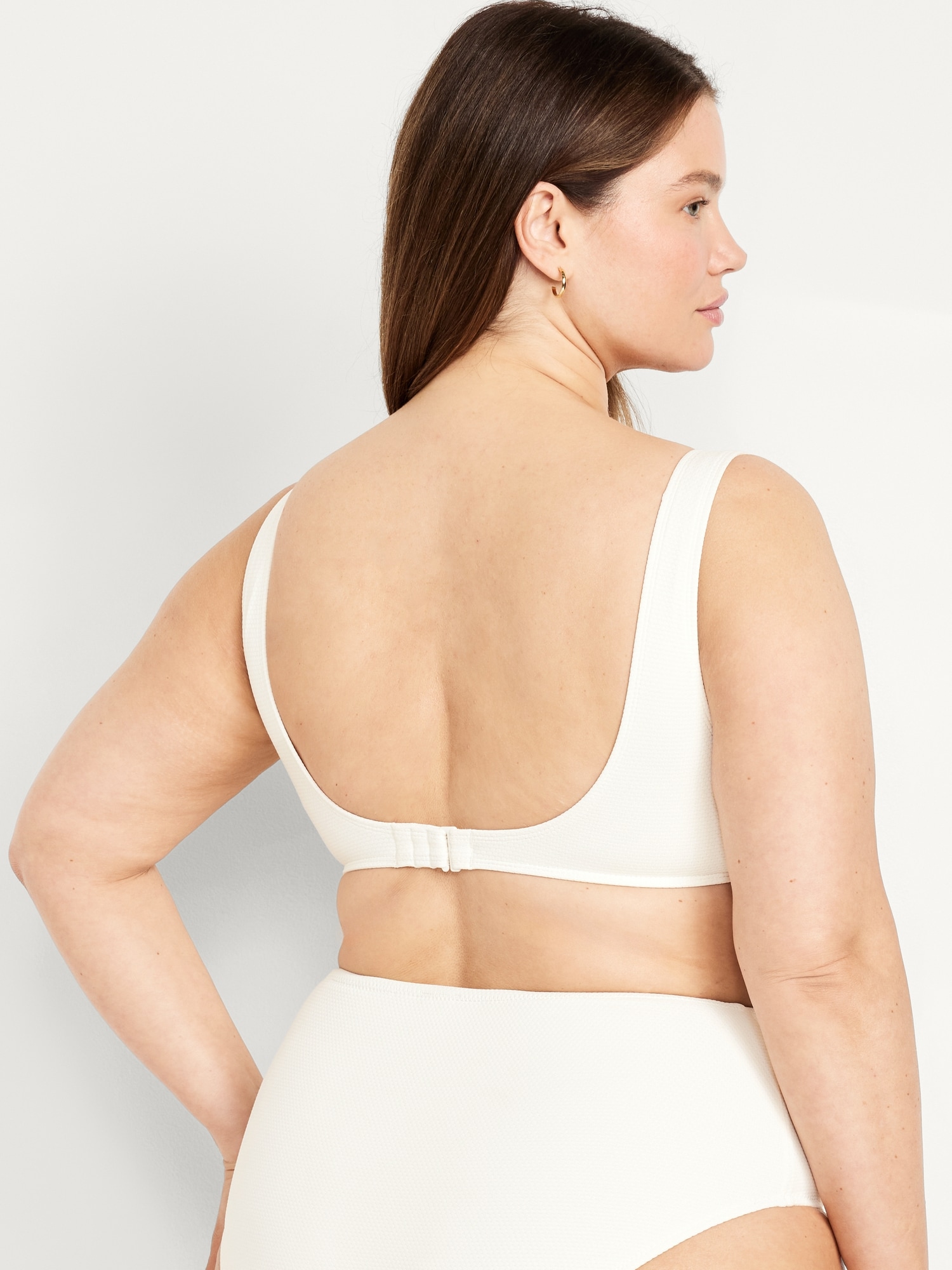Textured Swim Top: scoop neck, wide straps, ruched front with o-ring accent, removable cups, hook-and-eye clasp at back, #660878