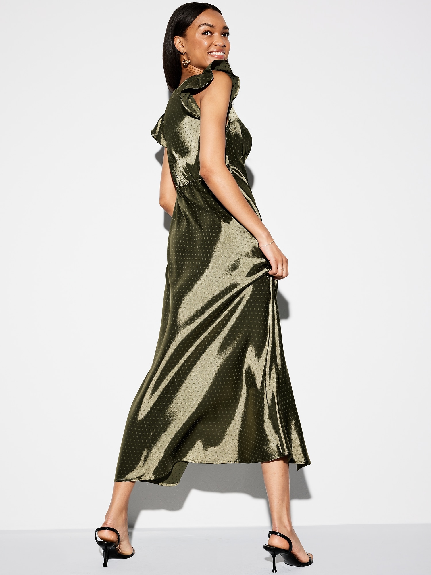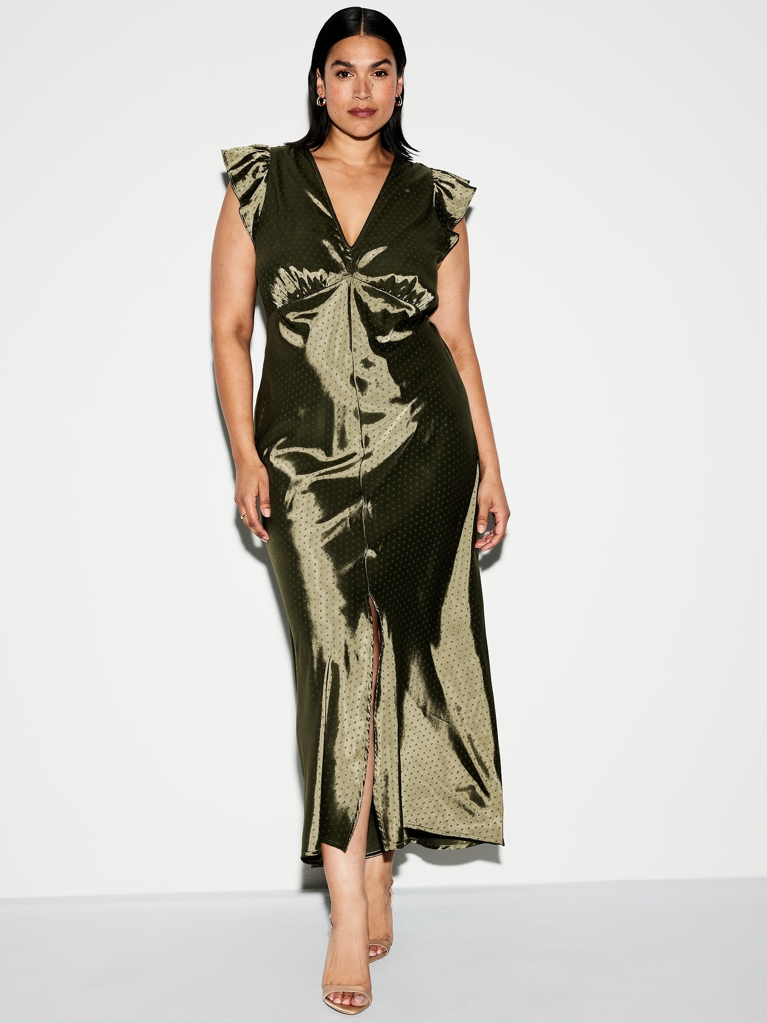 The Occasion by Old Navy Flutter-Sleeve Satin Maxi Dress: New! Special dresses and sets, made to make an entrance.deep v-neck, flutter-trim arm openings, seamed empire waist, center back elastic for comfort, front center slit, shirred detail, subtle tonal dots for a more dressed-up look, for parties, proms, graduations, weddings — these looks love an RSVP, #705416