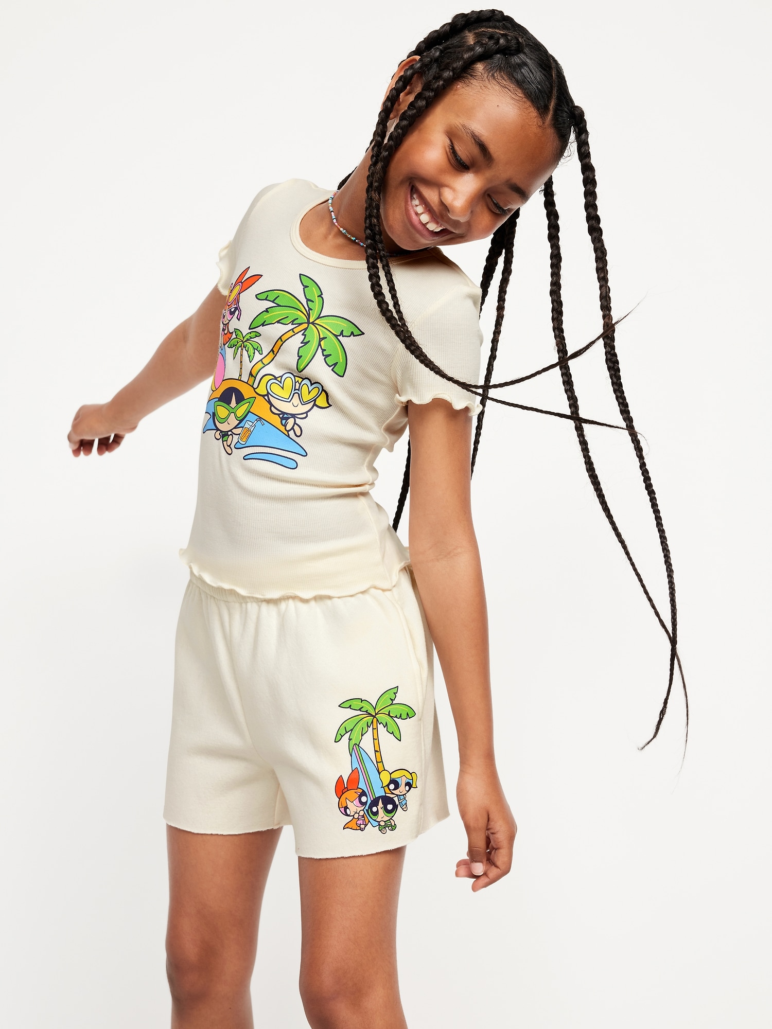 The Powerpuff Girls™ High-Waisted Graphic Shorts for Girls: high rise, elasticized waistband, on-seam welt pockets, cut-off leg cuffs, licensed graphic, Cartoon Network™ and © 2025. All rights reserved., #766330