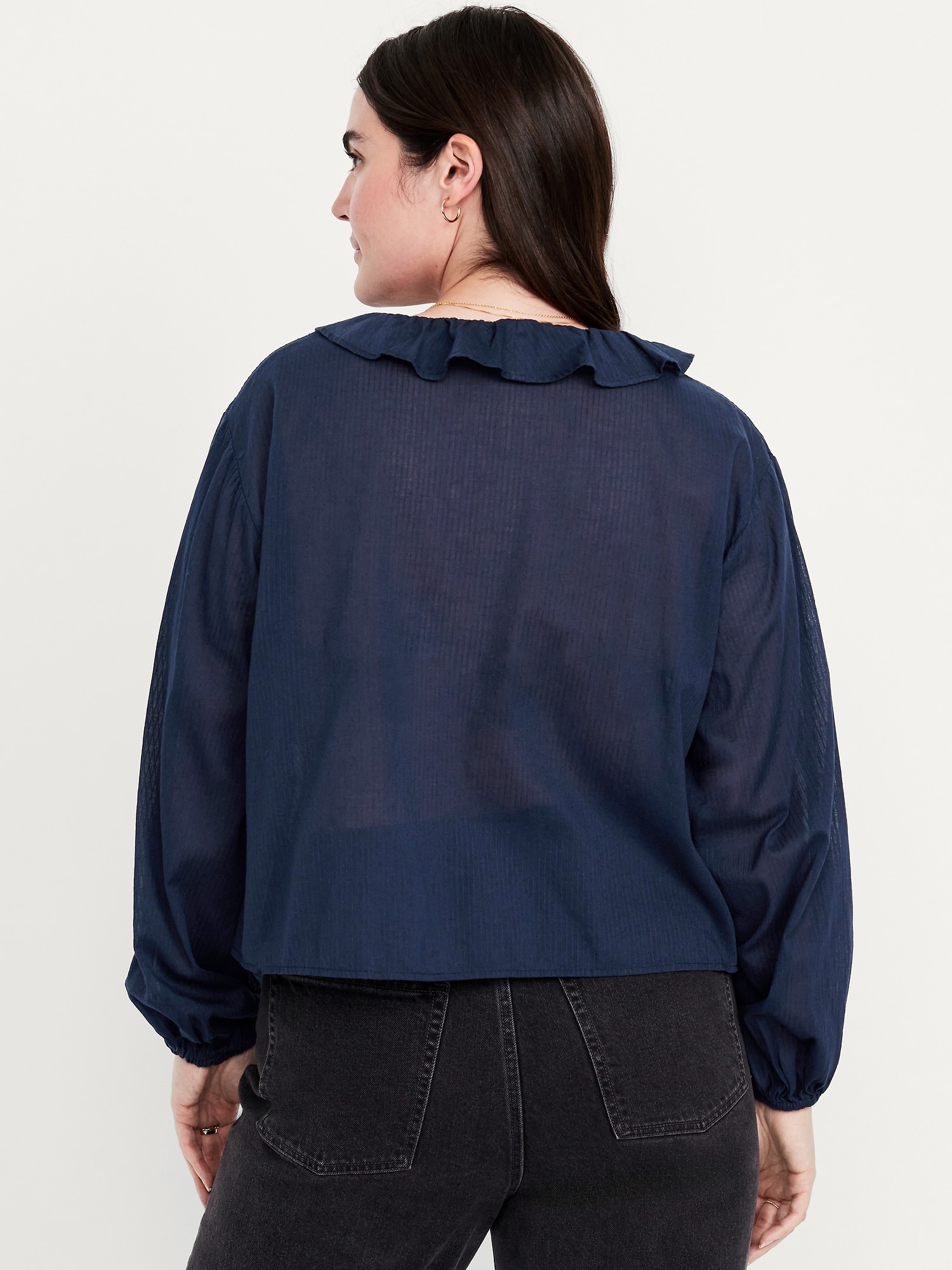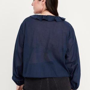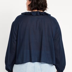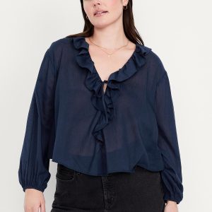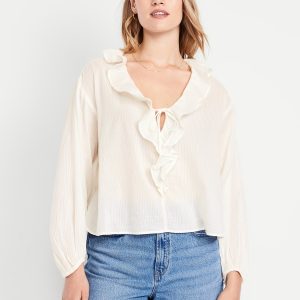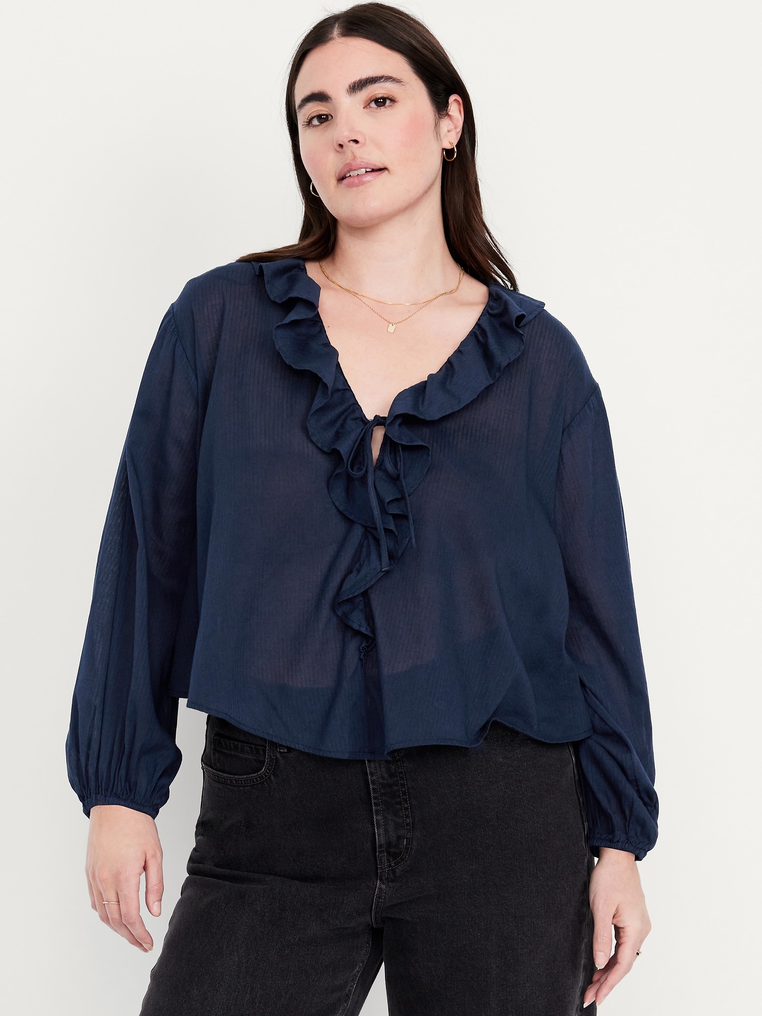 Tie-Front Ruffle Top: tie-neck detail, cascading ruffle overlay, long sleeves, elastic cuffs, #805731