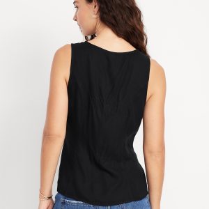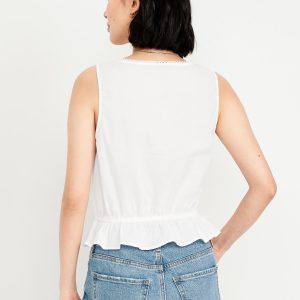 Tie-Waist Lace-Trim Top: picot lace-trim square neck, wide straps, five-button front, elastic tie-belt waist, #705128