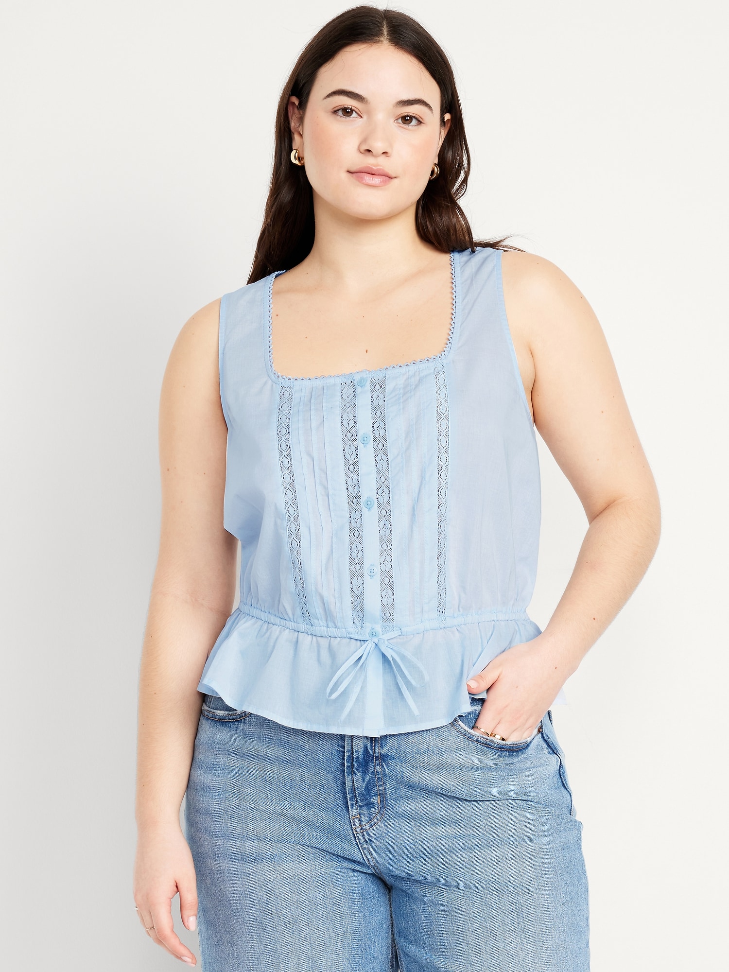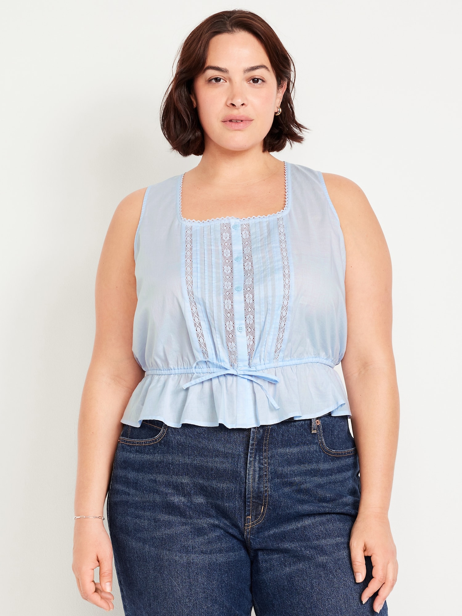 Tie-Waist Lace-Trim Top: picot lace-trim square neck, wide straps, five-button front, elastic tie-belt waist, #705128