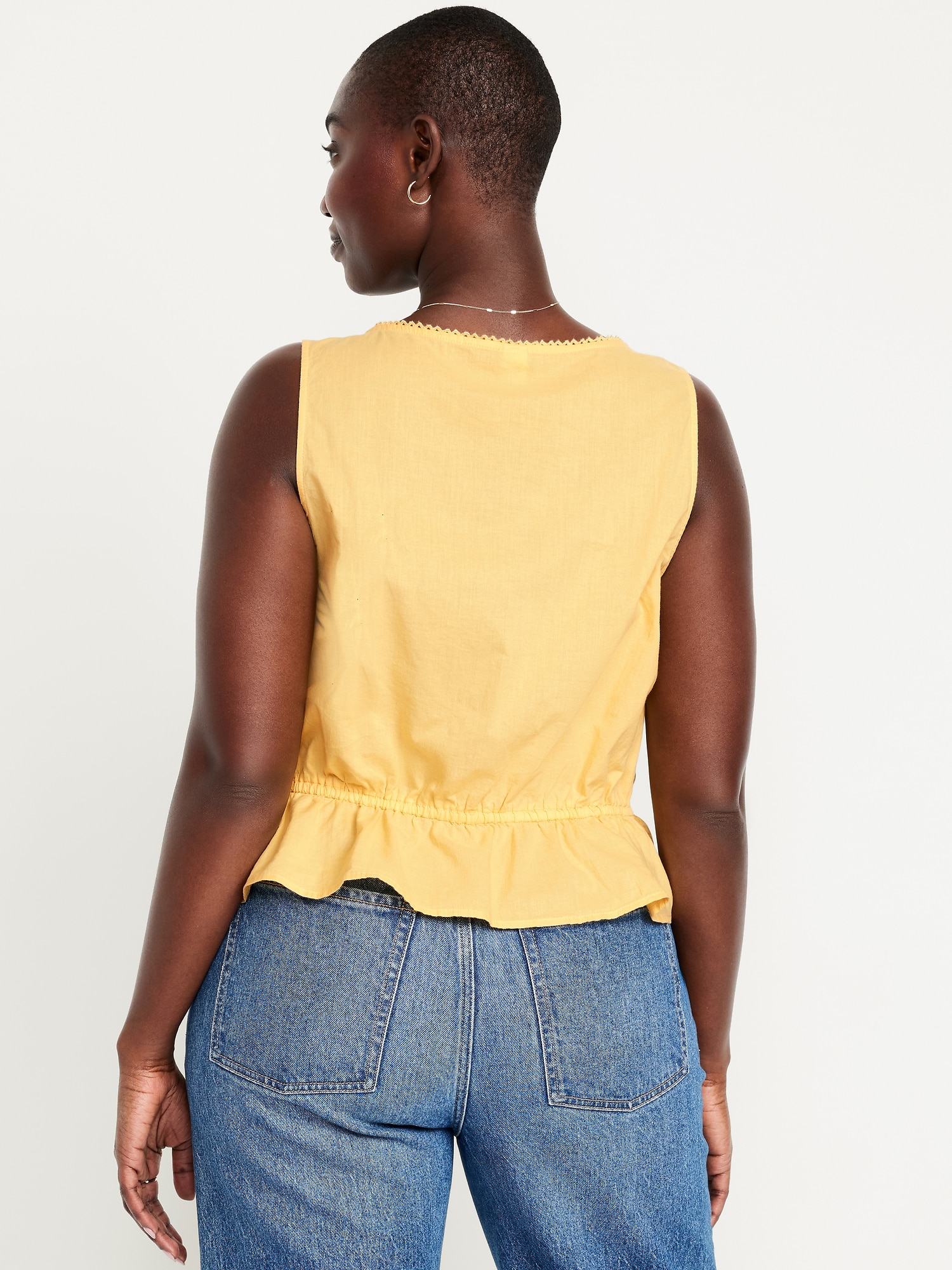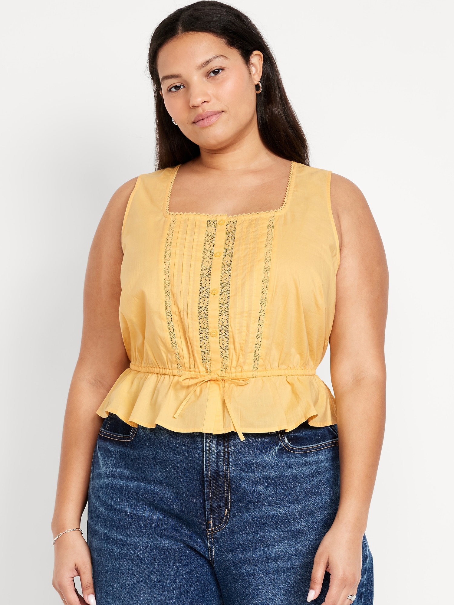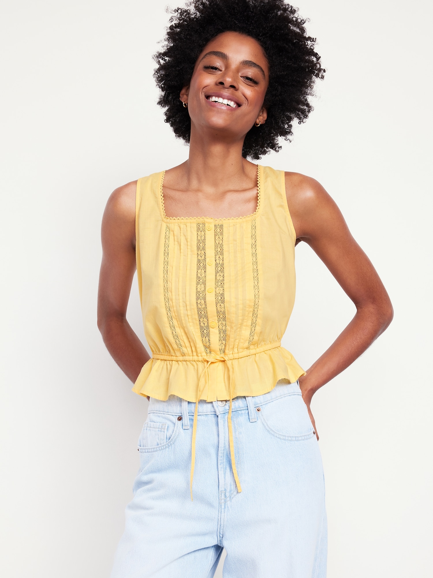 Tie-Waist Lace-Trim Top: picot lace-trim square neck, wide straps, five-button front, elastic tie-belt waist, #705128