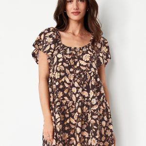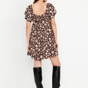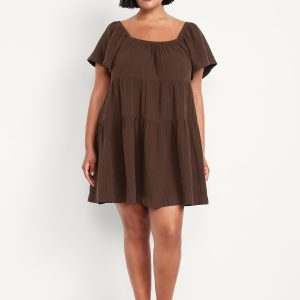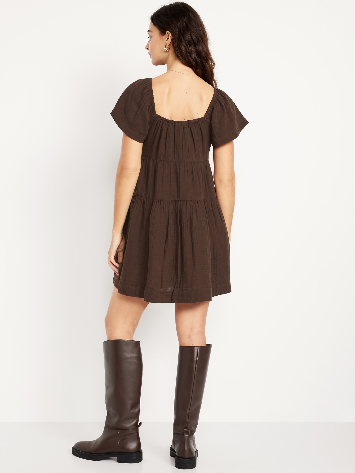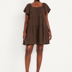 Tiered Mini Swing Dress: square elastic neckline, flutter sleeves, tiered seams, shirred detail, #809629