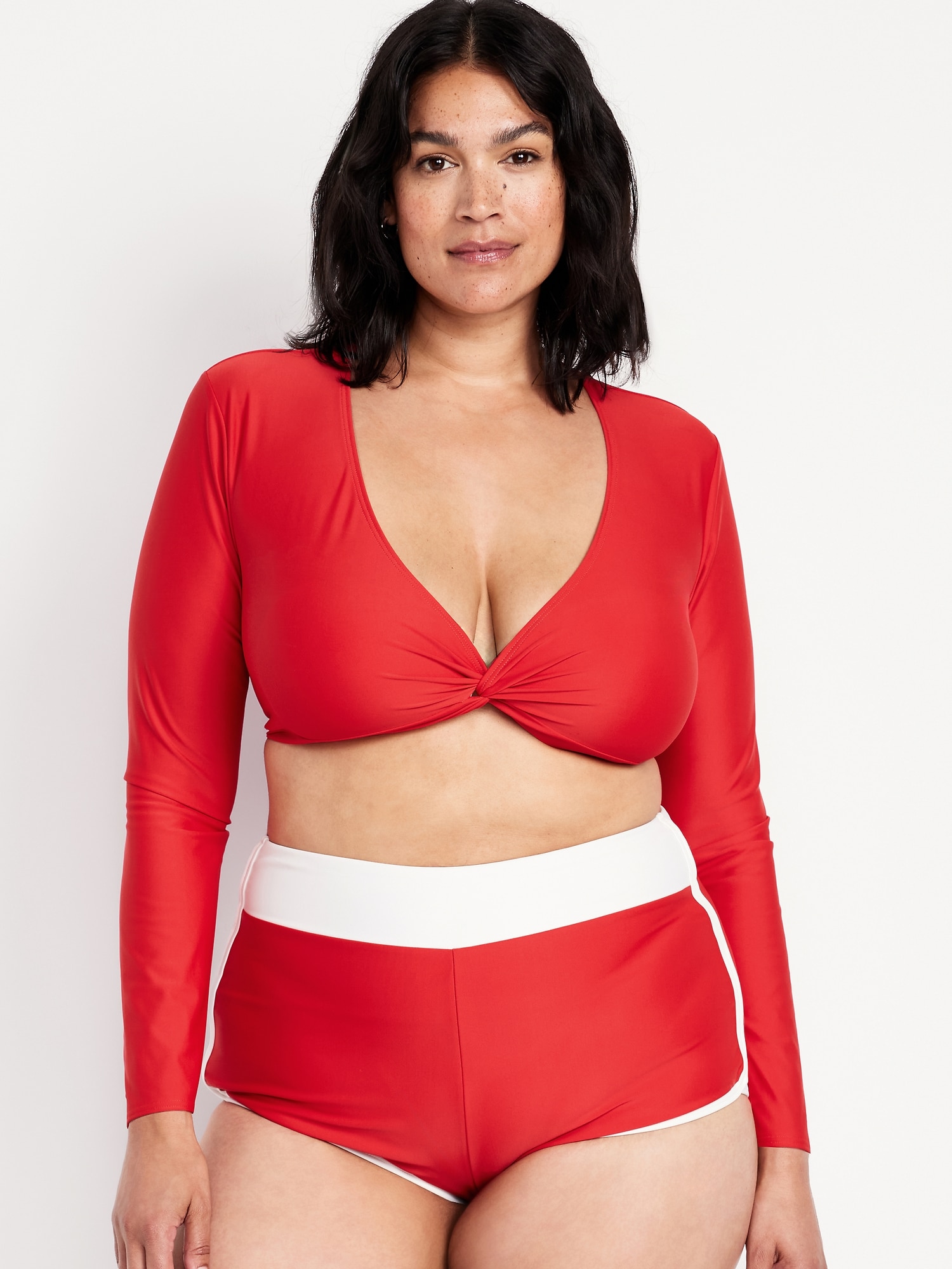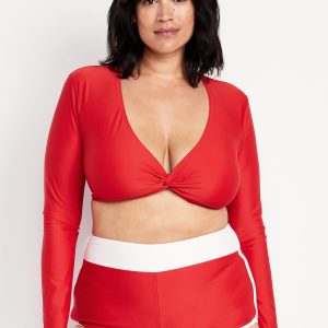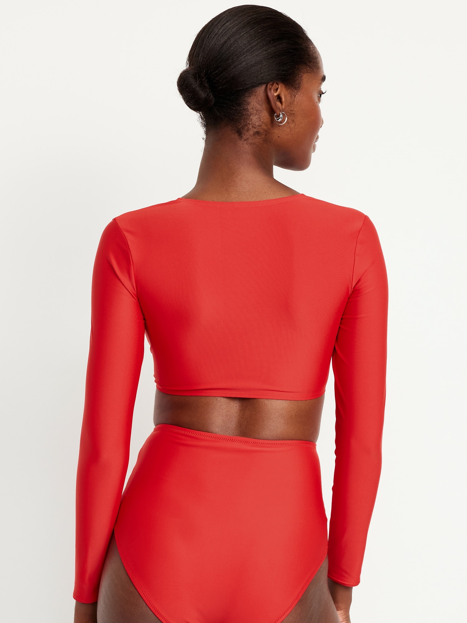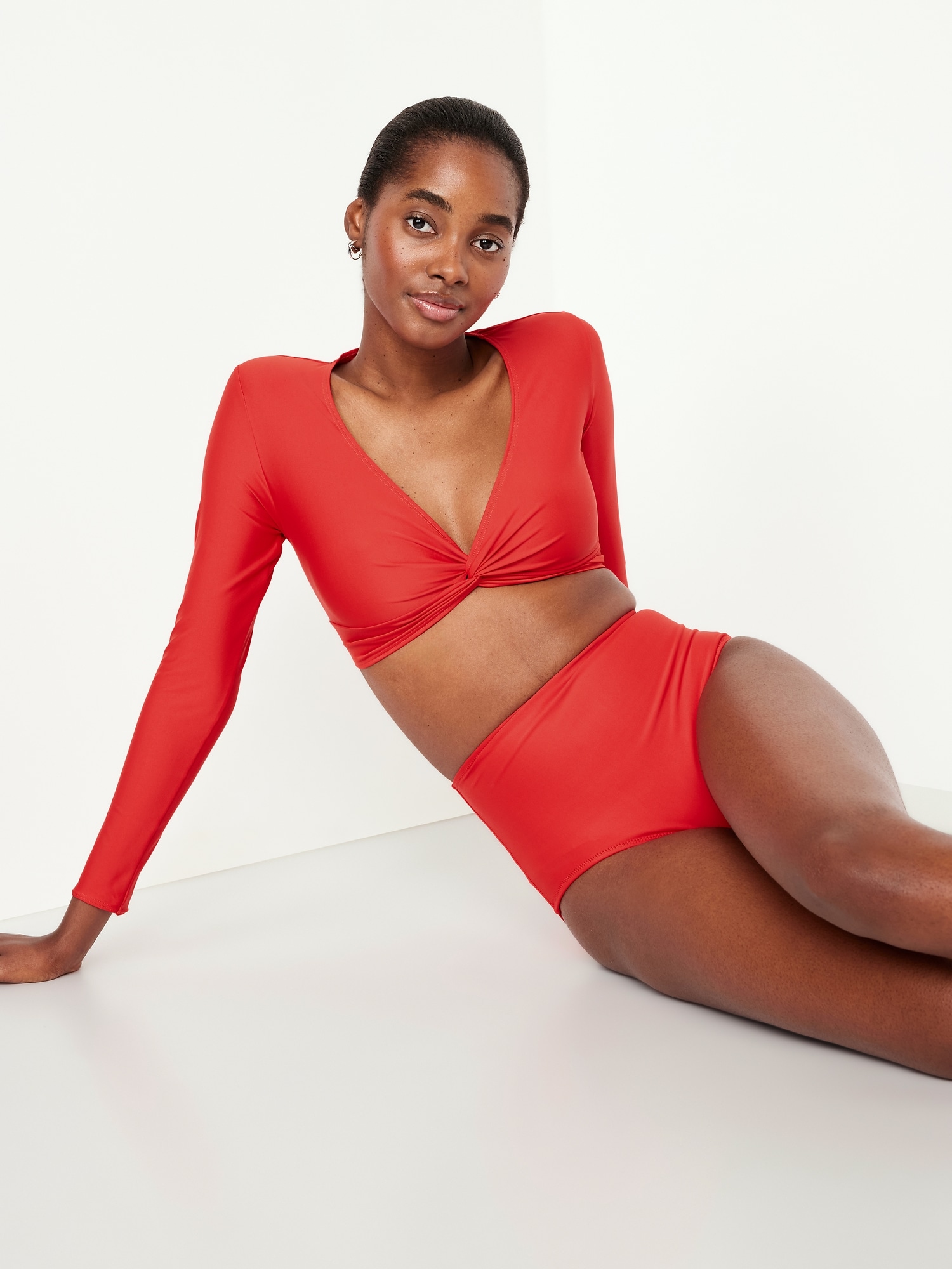 Twist-Front Matte Rashguard Swim Top: deep v-neck, long sleeves, twist-front accent, #747909