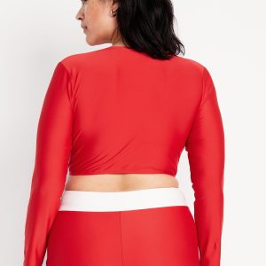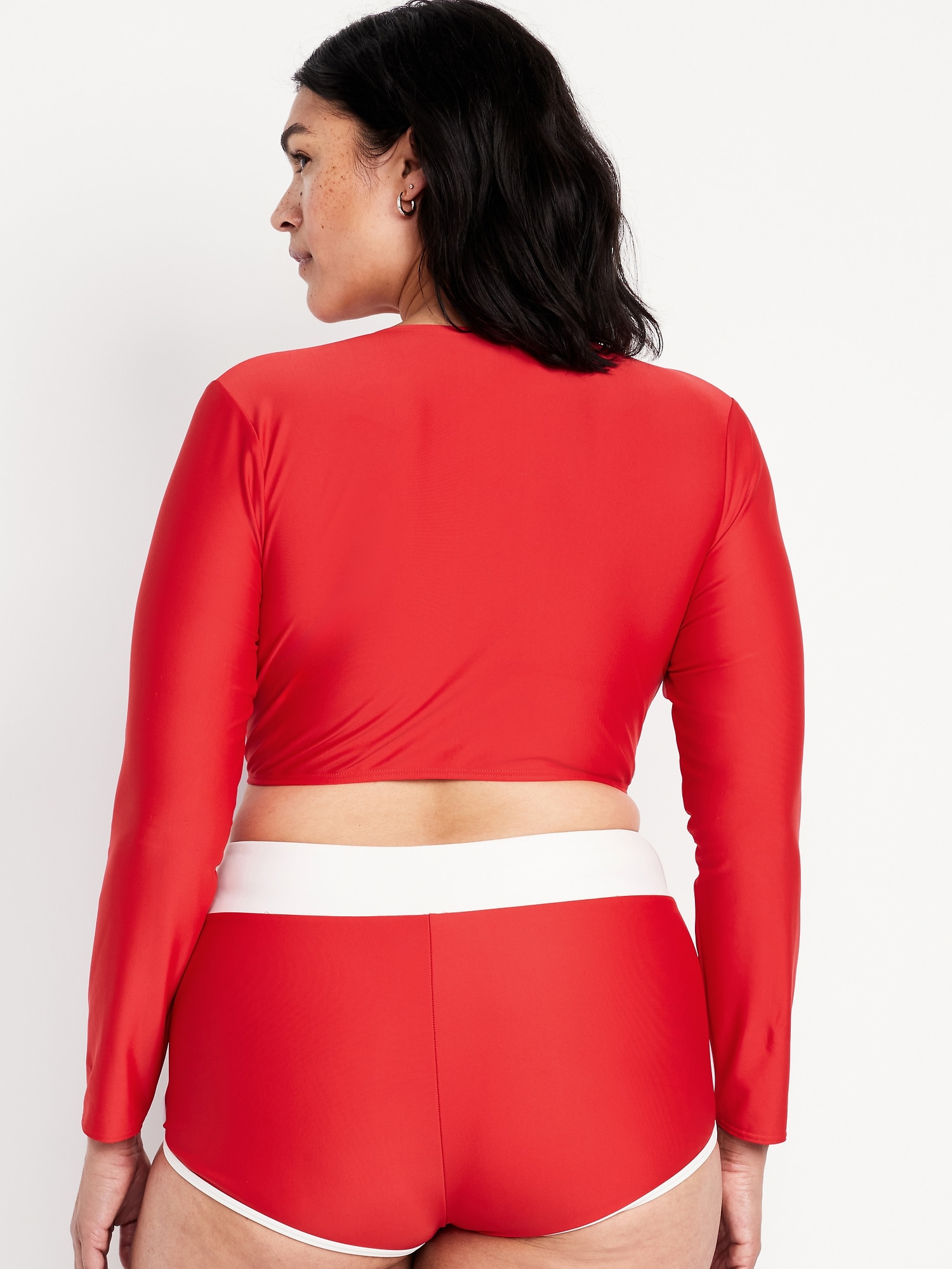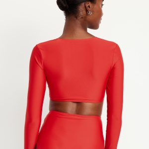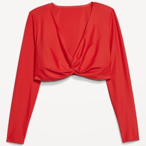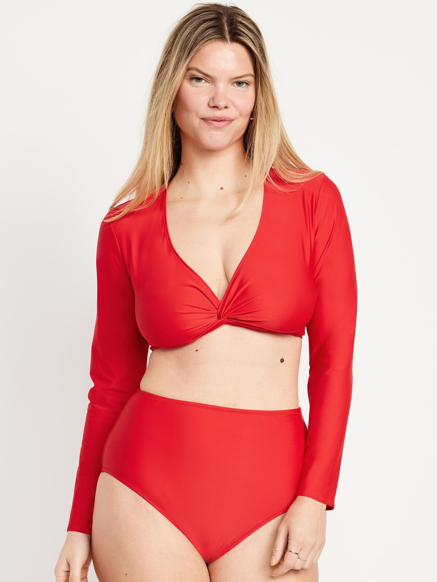 Twist-Front Matte Rashguard Swim Top: deep v-neck, long sleeves, twist-front accent, #747909