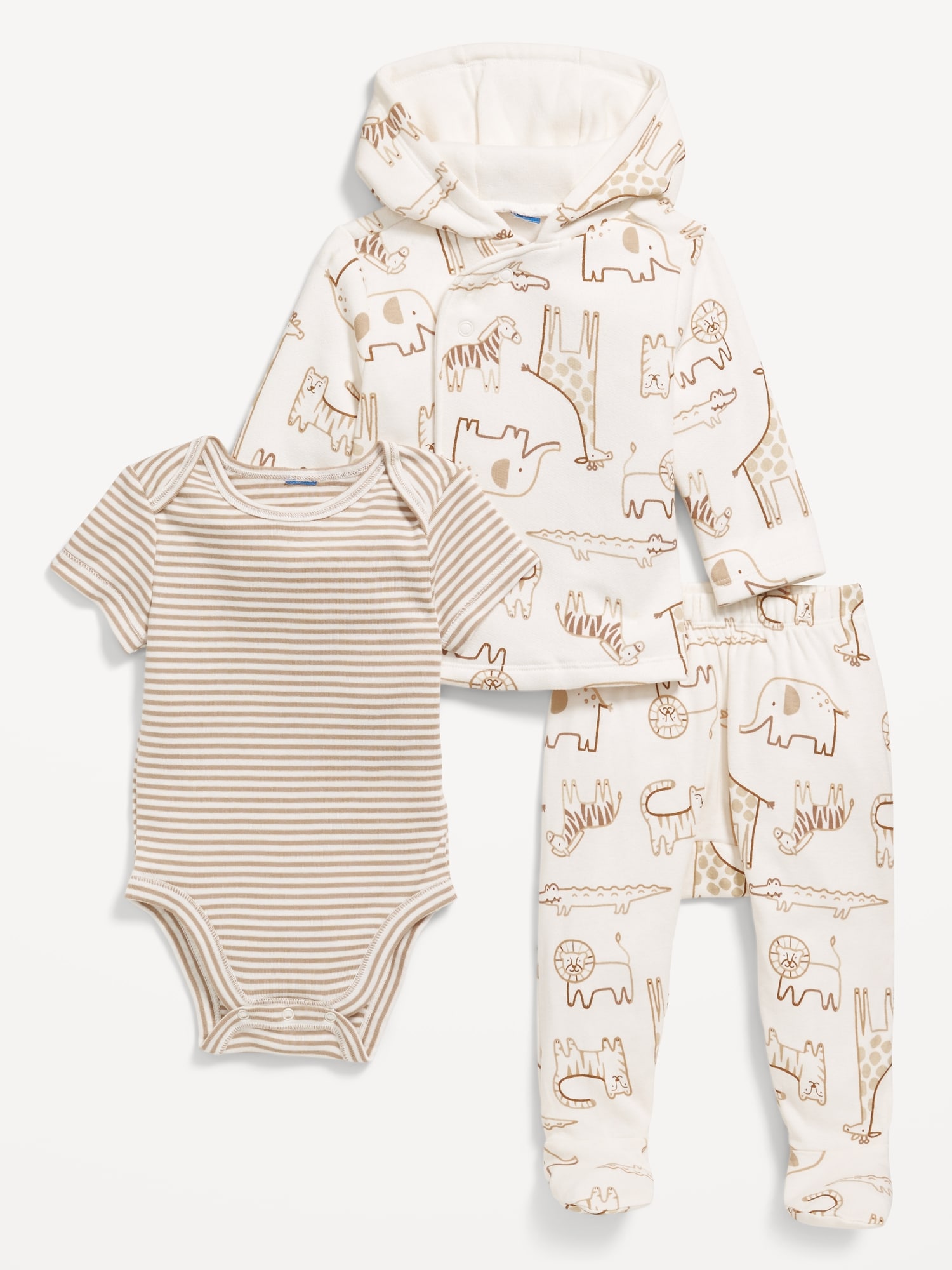 Unisex 3-Piece Printed Layette Set for Baby: bodysuit has envelope neckline, short sleeves, snaps along inseam, pants have elasticized waistband, sewn-in feet, hooded jacket has kimono style, double-breasted four-snap wrap front, online exclusive, #867901
