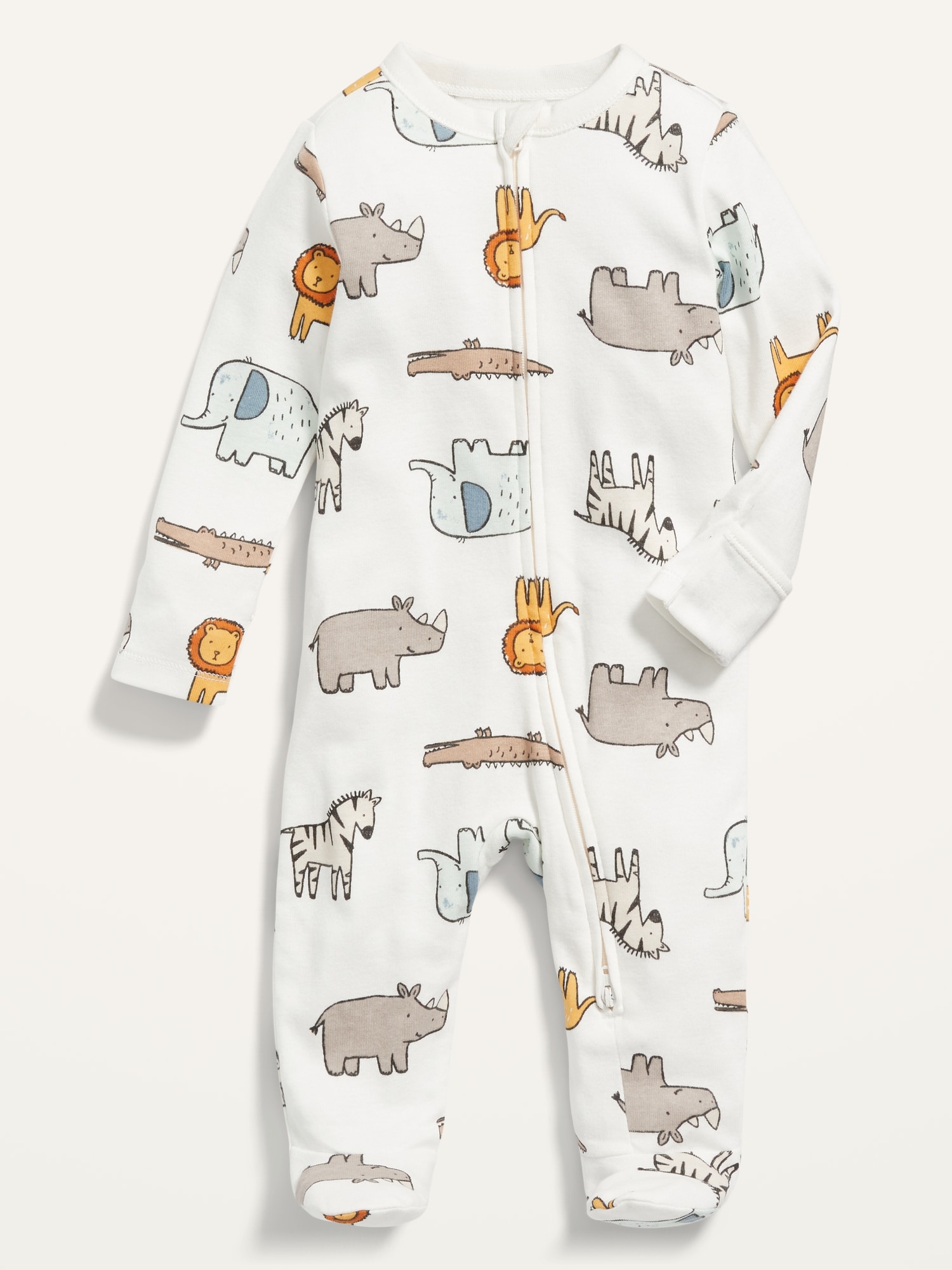 Unisex Animal-Print 2-Way-Zip Sleep & Play Footed One-Piece for Baby: This footed one-piece is totally adorable & unisex, too. Wearable & shareable for baby girl and baby boy!, Rib-knit crew neck., Long sleeves., Fold-over mittens at each sleeve flip over to keep baby’s hands warm and protect tender skin from scratches. Genius!, Reversible two-way zipper unzips from the bottom for quick diaper access. Baby changing just got so much easier (and warmer)., Sewn-in feet., Soft-washed 100% cotton knit., #878064