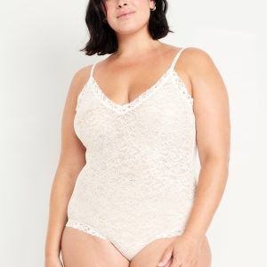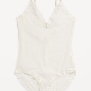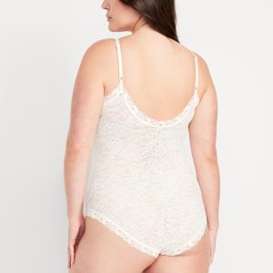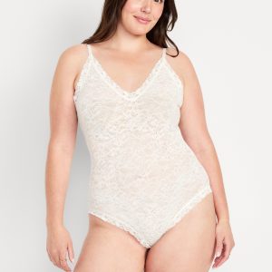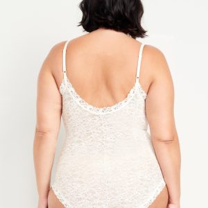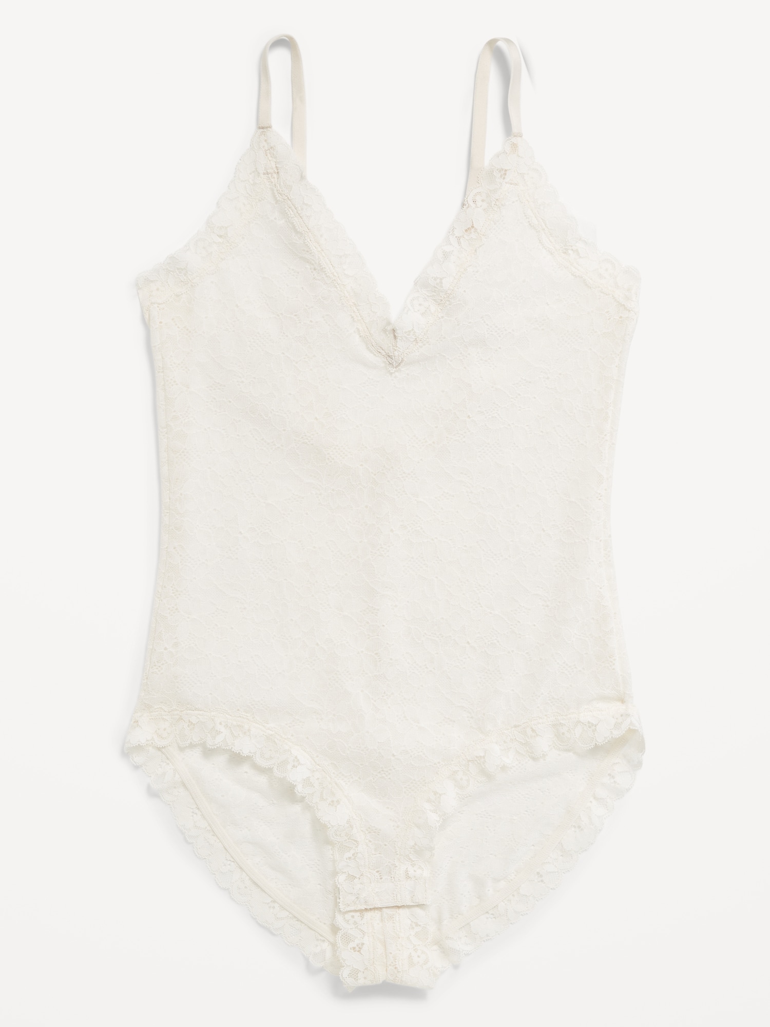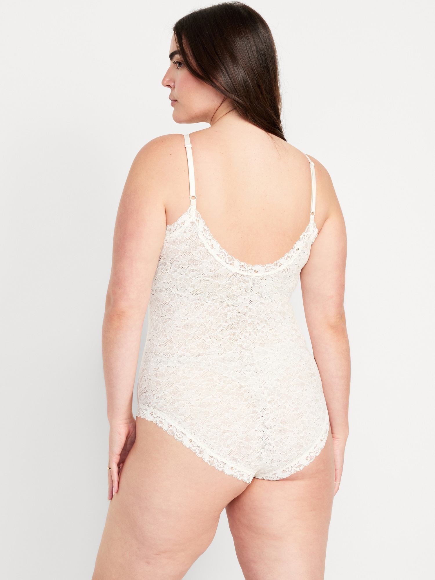 V-Neck Lace Bodysuit: deep v-neck, adjustable straps, scoop back, snaps at inseam, unlined, #487778