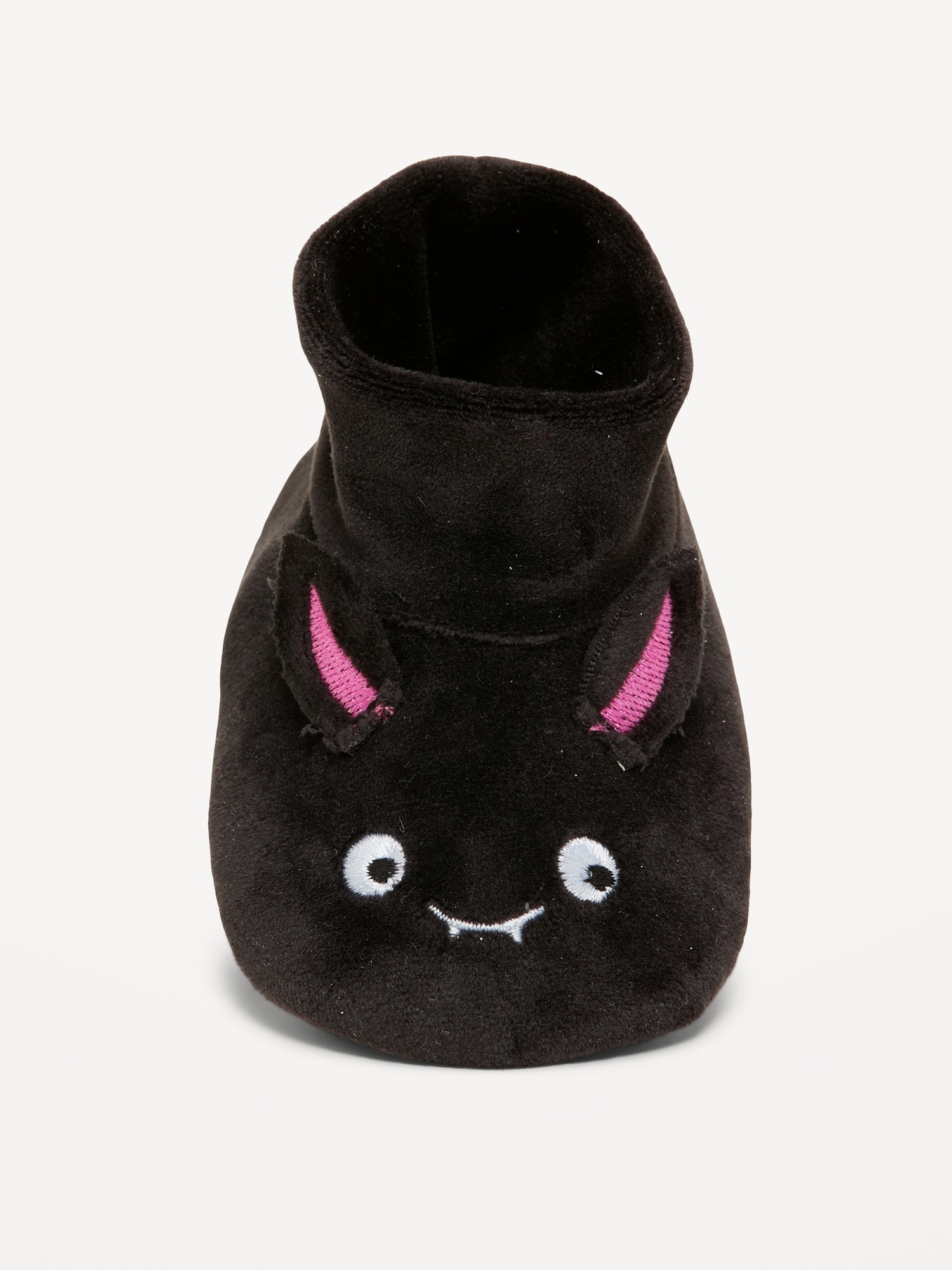 Velour Critter Slippers for Baby: bat features at front, faux-suede outsole, textured gripper dots, cozy cushioned foot bed, #787534