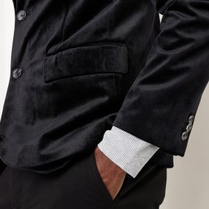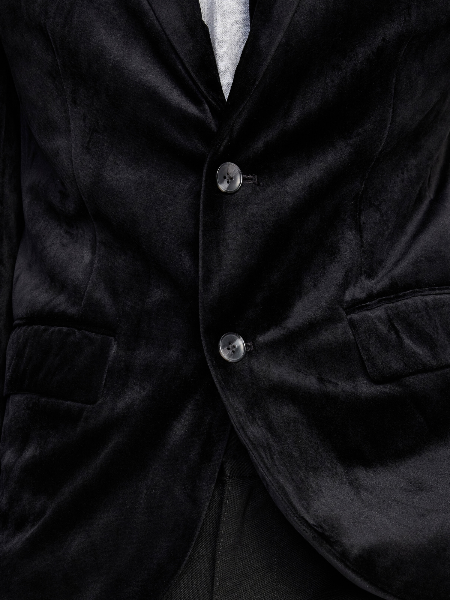 Velvet Blazer: notched lapel, long sleeves, double-button front, welt chest pocket, front flap pockets, hanging loop, #564227