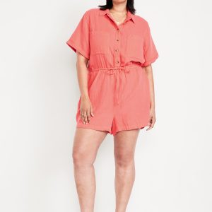 Waist-Defined Crinkle Gauze Romper: A light, rippled fabric that’s begging to be beachside.spread collar, short sleeves with rolled cuffs, button front, elastic waist with functional tie, patch chest pockets, diagonal front pockets, shirred detail, #705713
