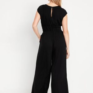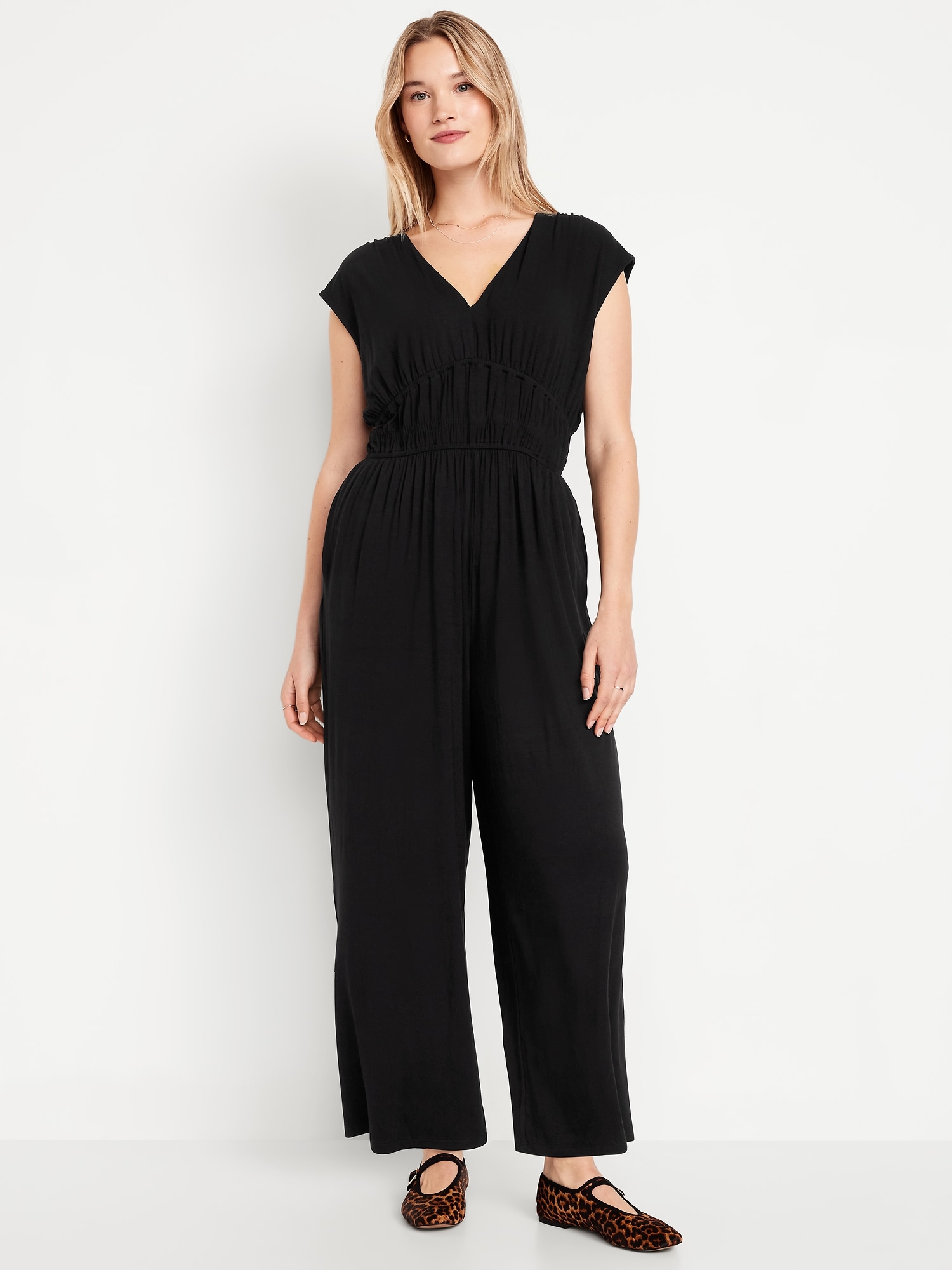 Waist-Defined Wide-Leg Jumpsuit: deep v-neck, sleeveless, elastic waist, on-seam hip pockets, wide leg, #705285