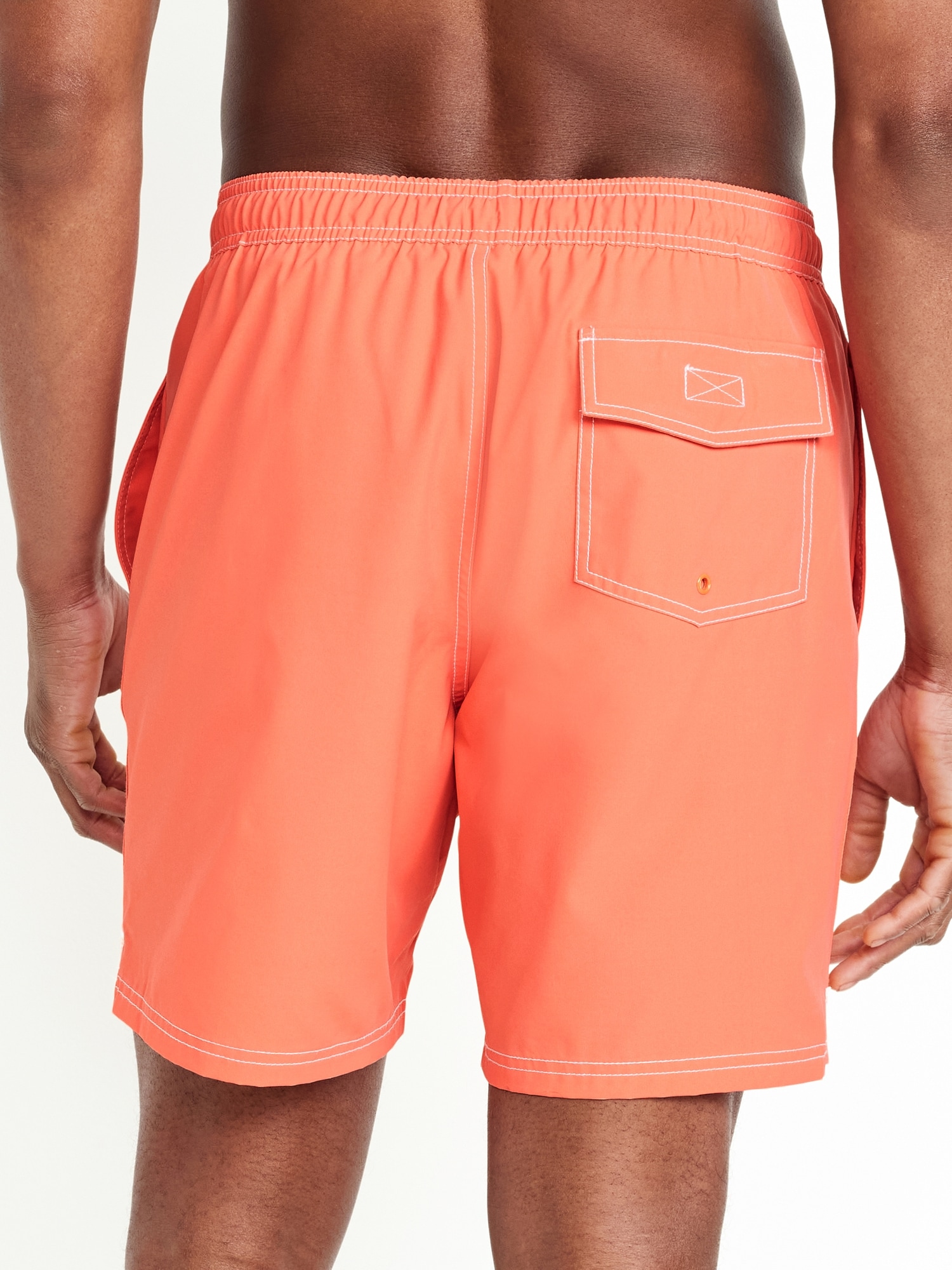 Washed Swim Trunks — 7-inch inseam: elastic-drawstring waistband, on-seam pockets, back patch pocket with grommet drain, built-in mesh briefs, pull-on style, #766290