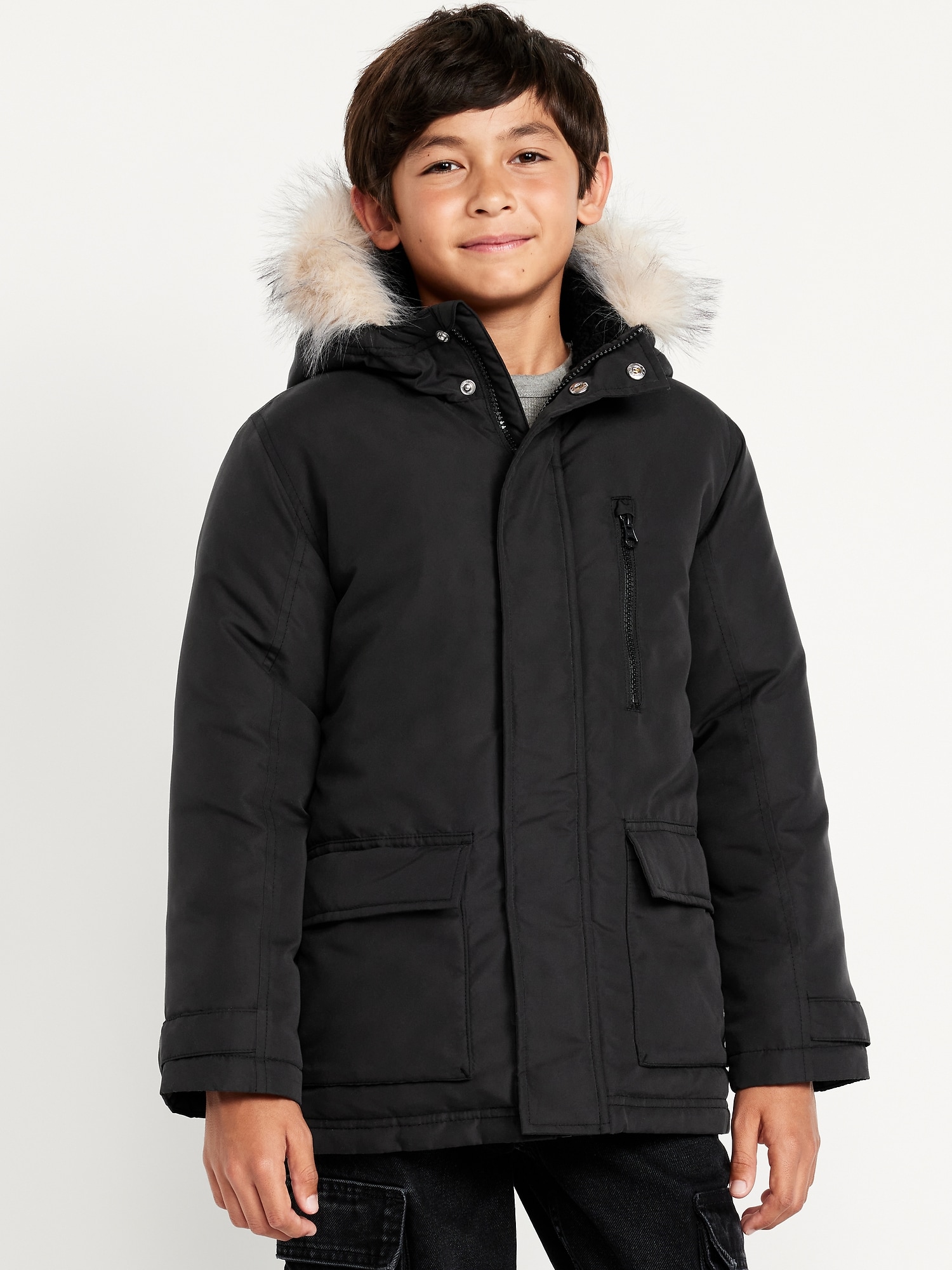 Water-Resistant Faux-Fur Hooded Parka Jacket for Boys: built-in hood, faux fur trim along hood, full length zipper and snap button placket, zippered pocket at chest, flap pockets at front, on-seam side pockets, water resistant, #800740