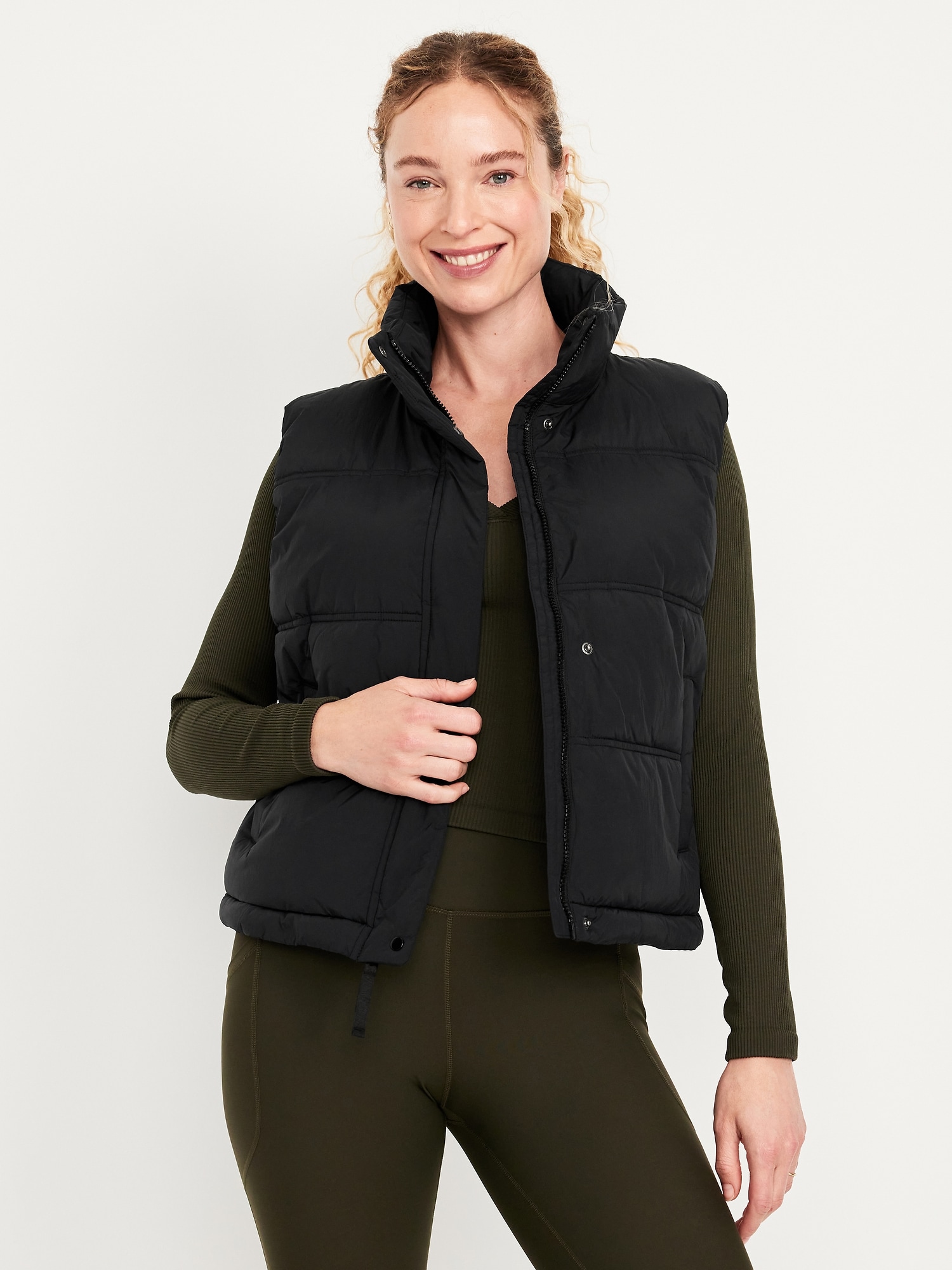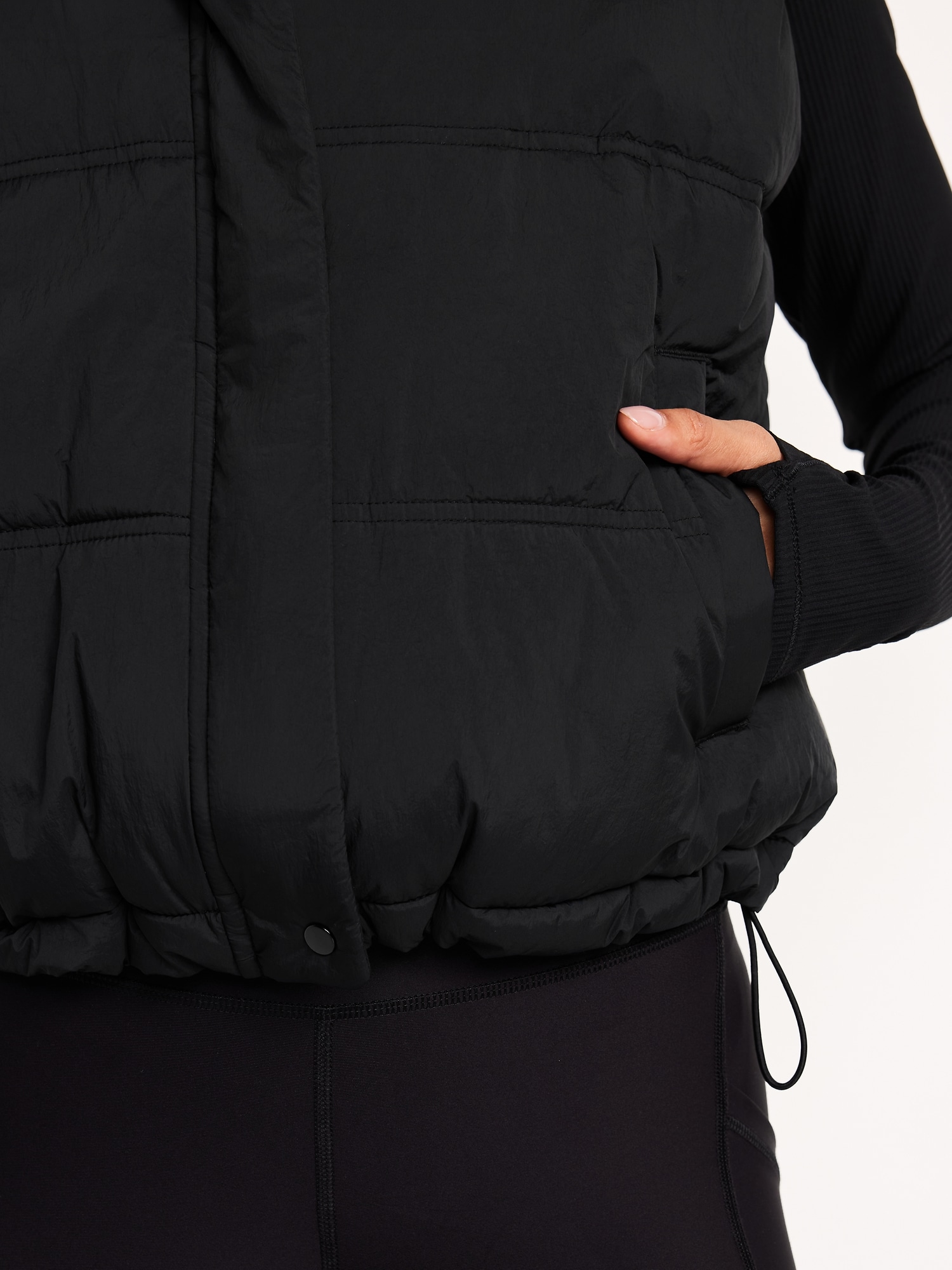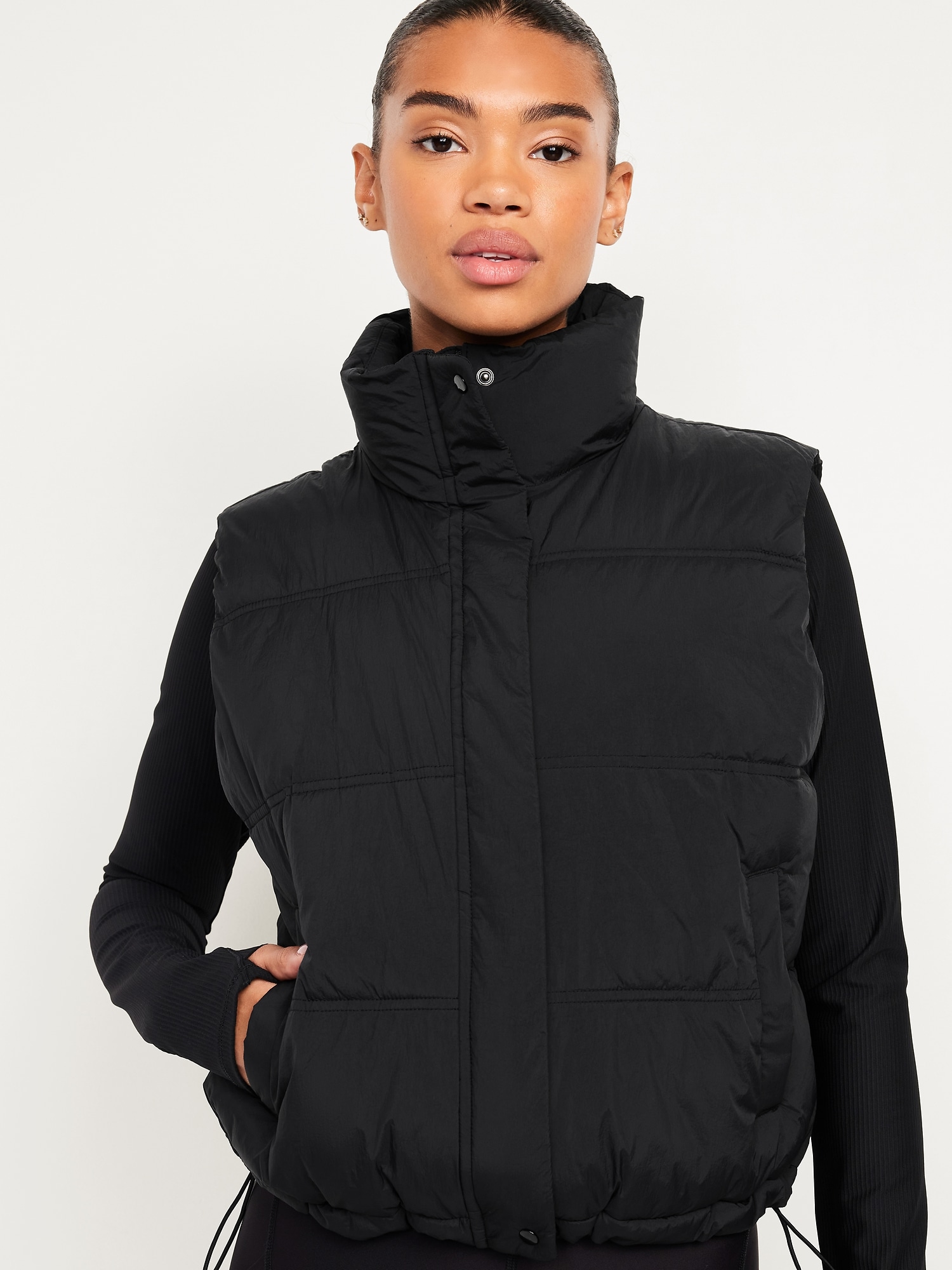 Water-Resistant Puffer Vest: mock neck, snap front with covered zipper, vertical welt pockets, adjustable bungee-cord waist, fully lined, #784467