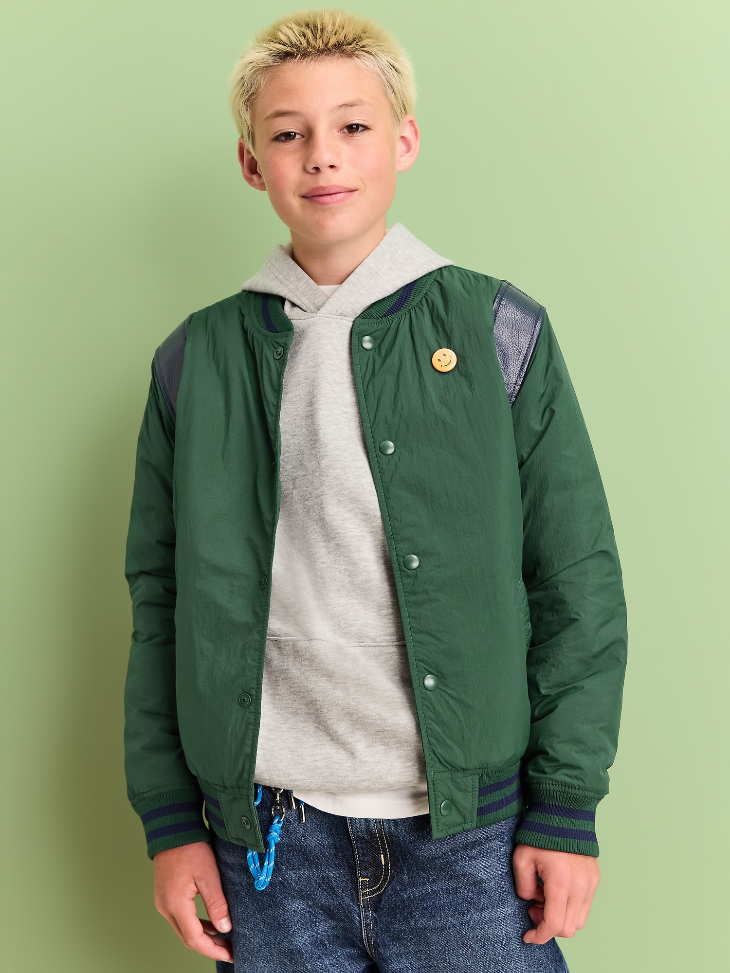 Water-Resistant Vintage-Style Bomber Jacket for Boys: standing rib-knit collar, long sleeves, rib-knit cuffs, full-length snap-button placket, diagonal welt pockets, rib-knit hem, faux leather piecing at shoulders, water resistant, #800738