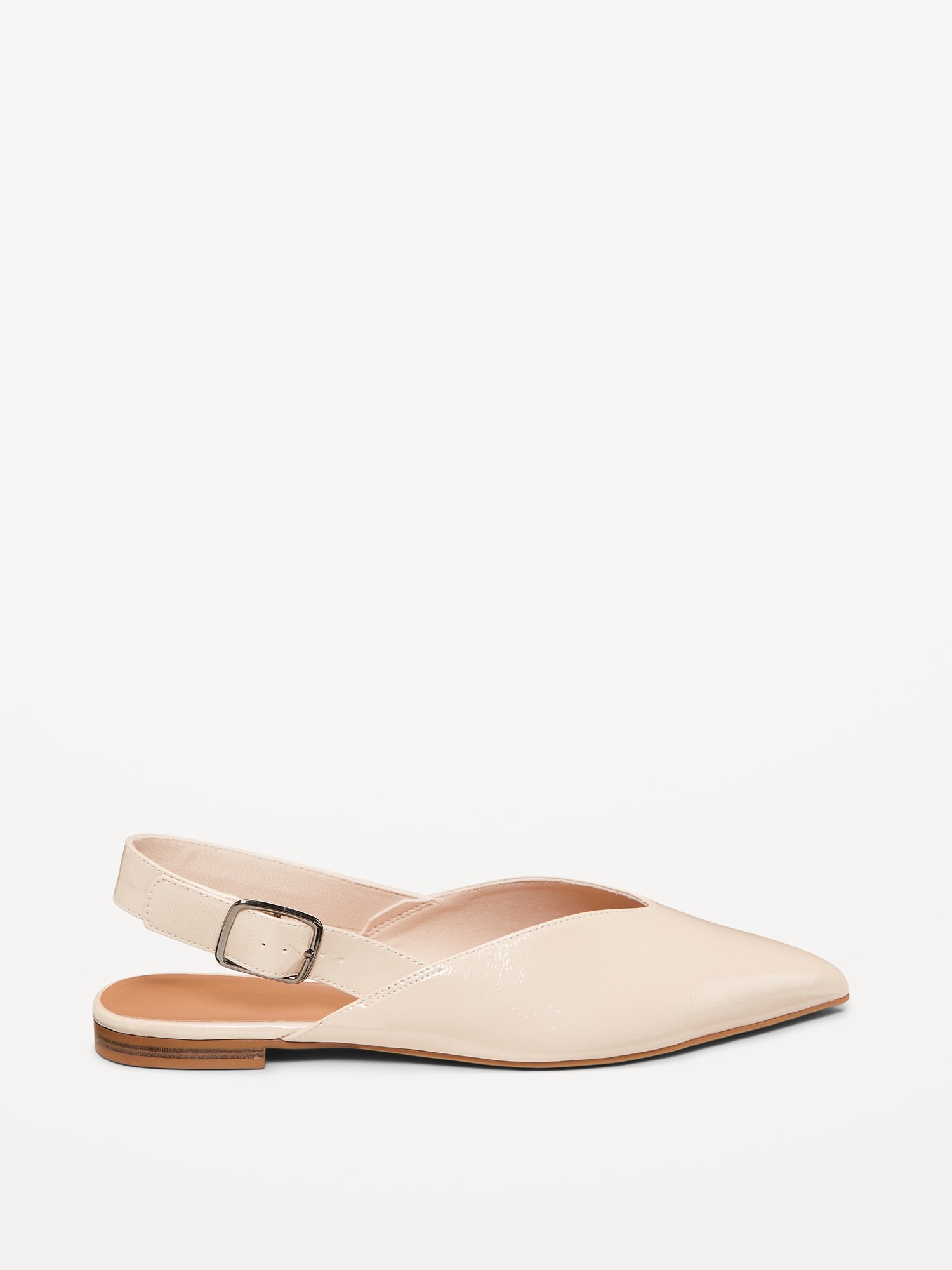 Wide Strap Slingback Flats: pointed toe, V-cut, buckle fastening at ankle, open heel, firm foot bed, textured outsole, #750760