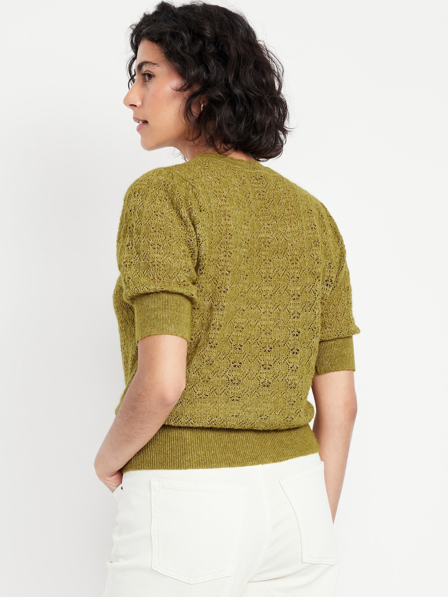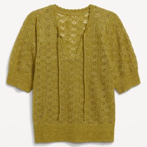 Wool-Blend Puff-Sleeve Tie-Neck Sweater: tie-front neck with keyhole cutout, elbow-length puff sleeves, pullover style, #785108