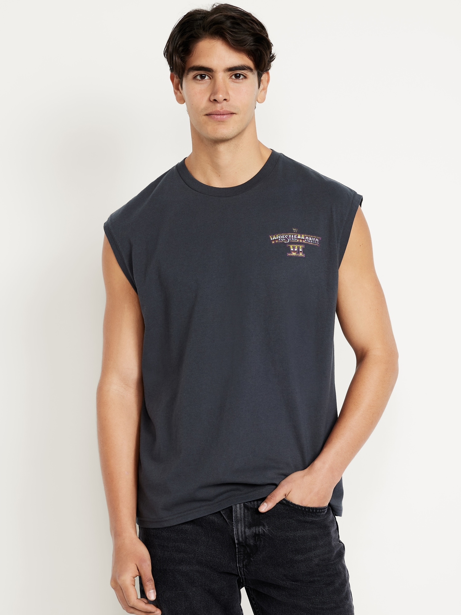 WWE™ WrestleMania Muscle Tank Top: crew neck, sleeveless, licensed graphic, online exclusive, © Fanatics, LLC., 2025. All Rights Reserved., #751685